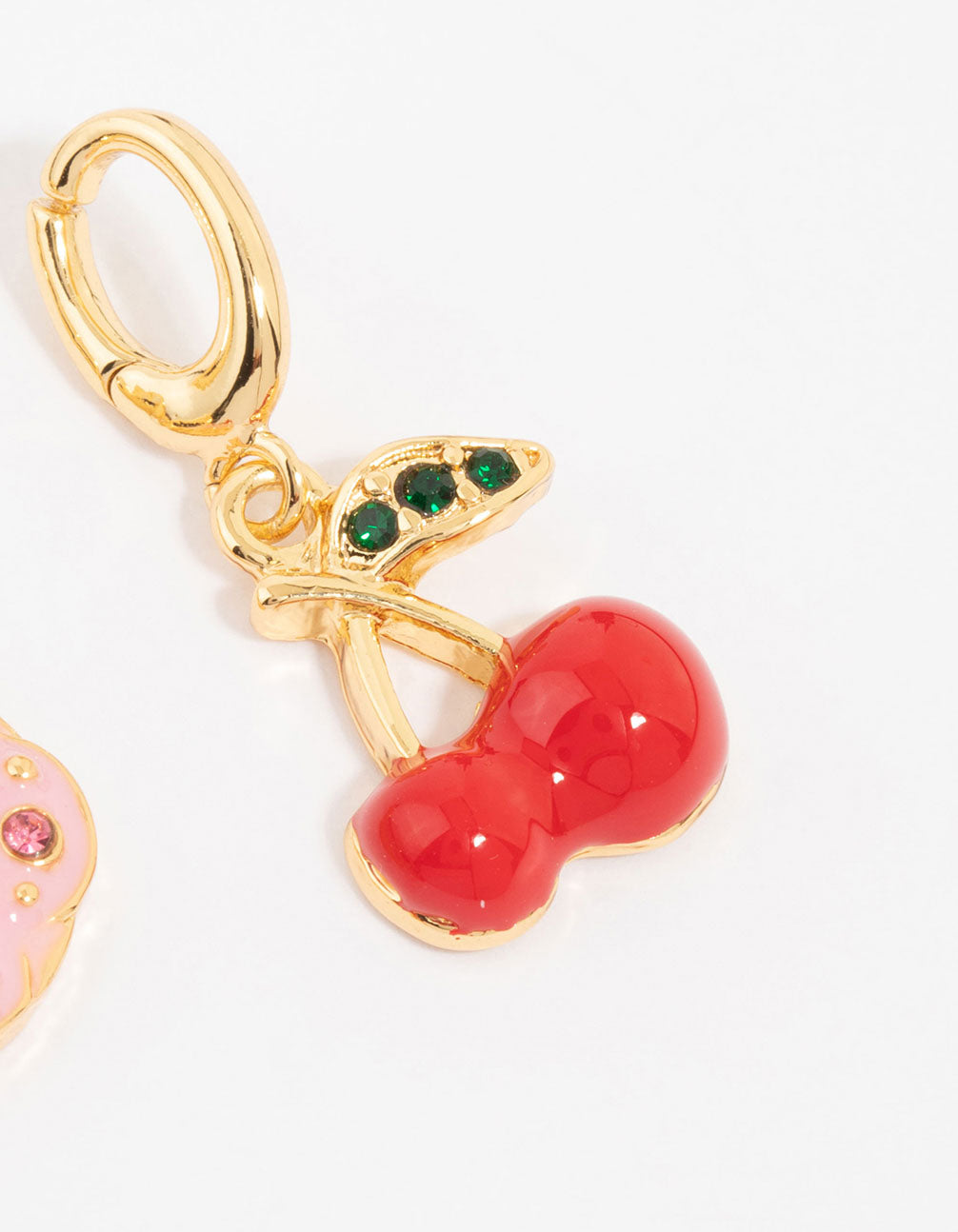 Add some sweetness to your style with this gold-plated charm trio! Featuring a strawberry, doughnut, and cherry charm, it's perfect for a fun and fruity look.