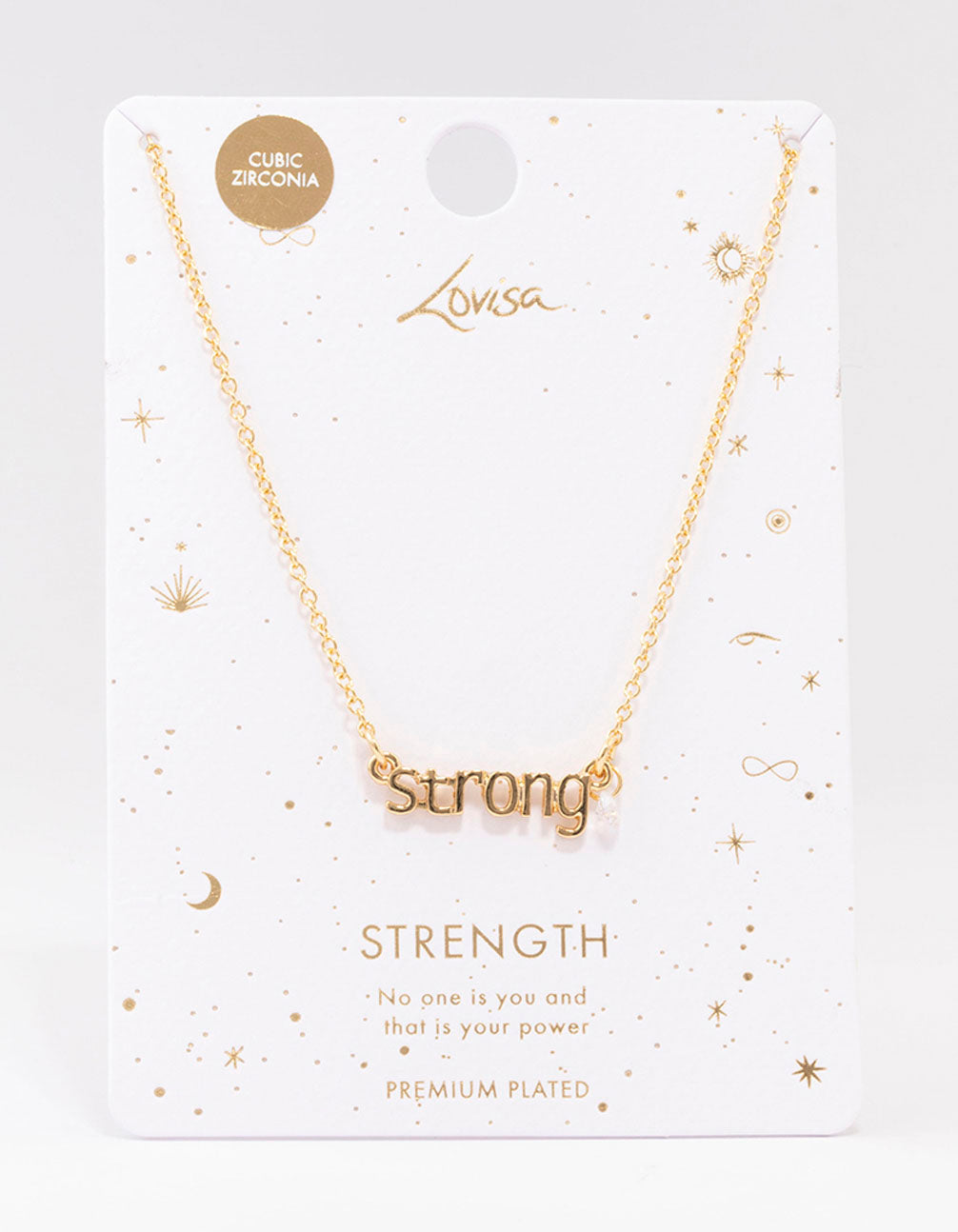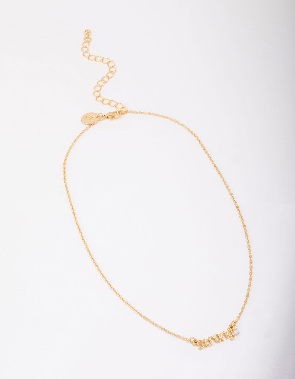 This chain is plated with real gold and features the word 'Strong' written in script, perfect for serving as a reminder in your everyday stack.