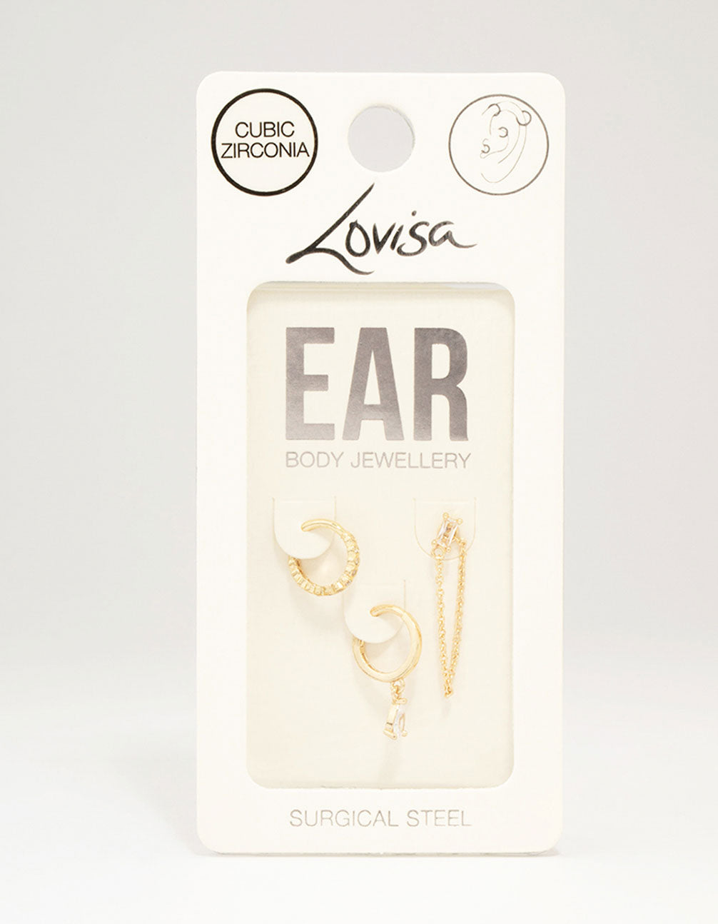 Personalise your stack with our selection of premium, surgical steel piercing jewellery. This ear piercing pack contains a chain flat back and two clicker rings, each plated with real gold and adorned with cubic zirconia crystals for a glamorous finish.