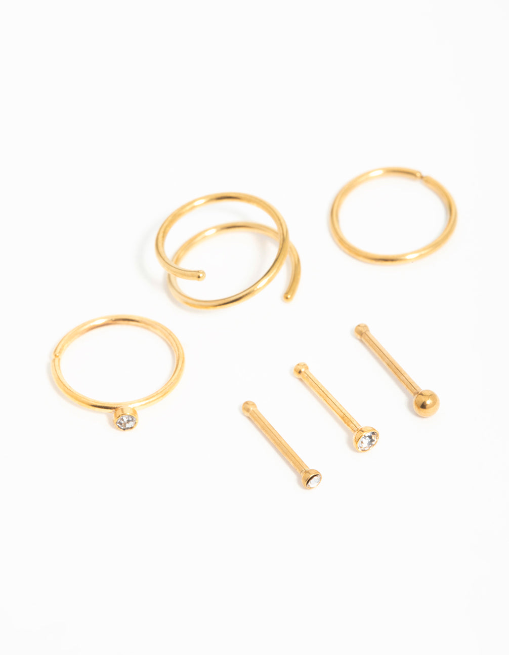 Add a touch of sparkle to your everyday look with this Gold Plated Surgical Steel Cubic Zirconia Bezel Nose Piercings Pack. This versatile set of nose jewellery is perfect for switching up your style, whether you're rocking casual vibes or dressing up for a night out. It includes a sleek nose ring, a twisted nose ring, a cubic zirconia-accented nose ring, and three chic nose studs: one sleek and two adorned with cubic zirconia crystals. Crafted from durable surgical steel and coated in luxurious gold plating, these pieces are designed to be stylish and comfortable. The mix of minimalistic and sparkling designs means you can pair them effortlessly with anything—think cosy jumpers and jeans or your favourite party dress. A must-have for any nose piercing collection, this set is the perfect blend of elegance and edge!