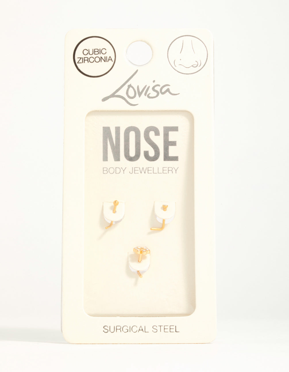 Gold Plated Surgical Steel Cubic Zirconia Flower Nose Piercings 3-Pack