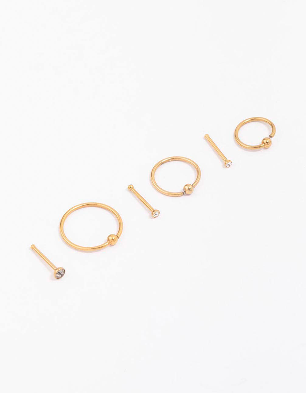 Customise your nose piercing with this pack of surgical steel body jewellery. This set of nose rings includes a mix of six different nose studs and rings, each plated with real gold for a premium finish.