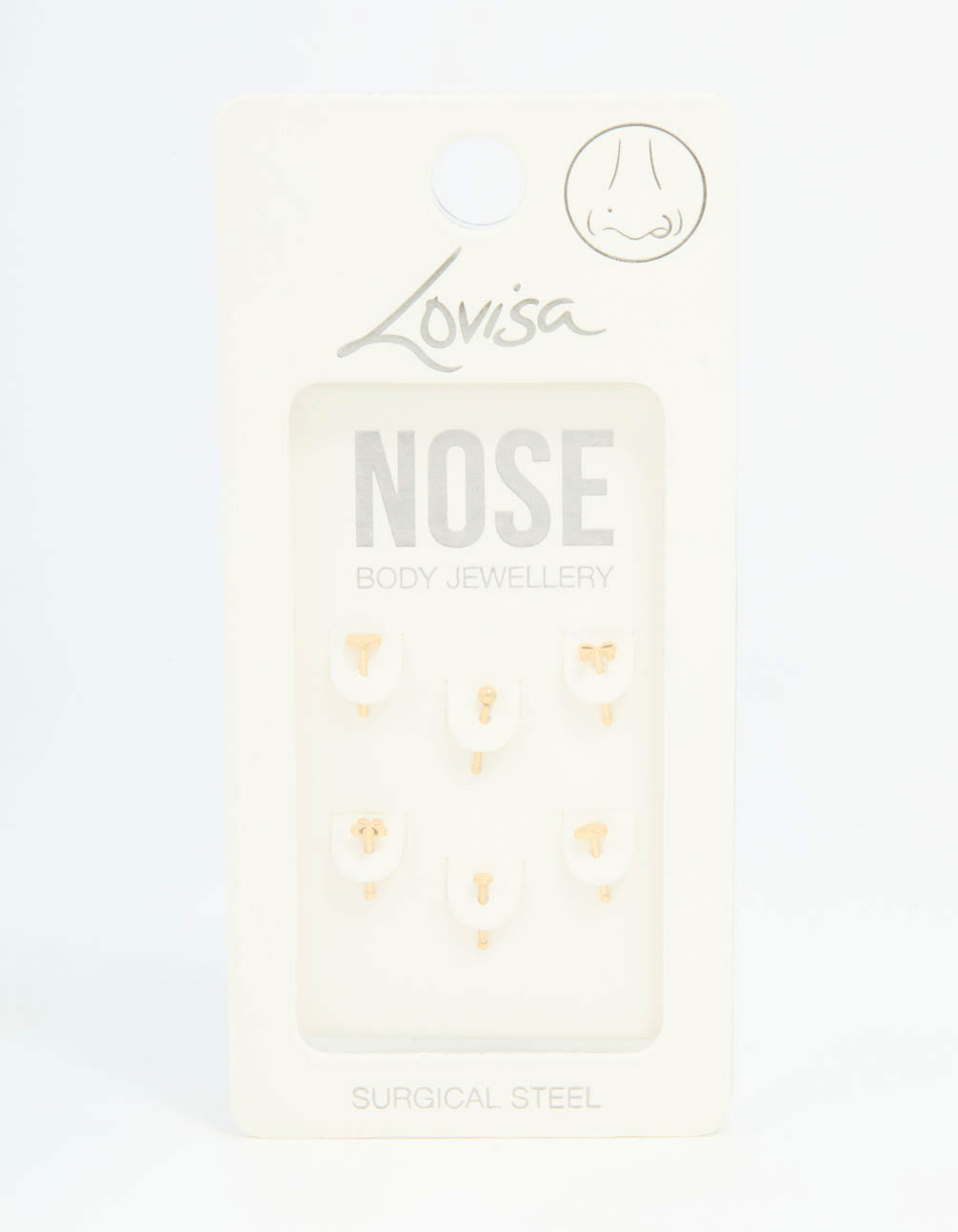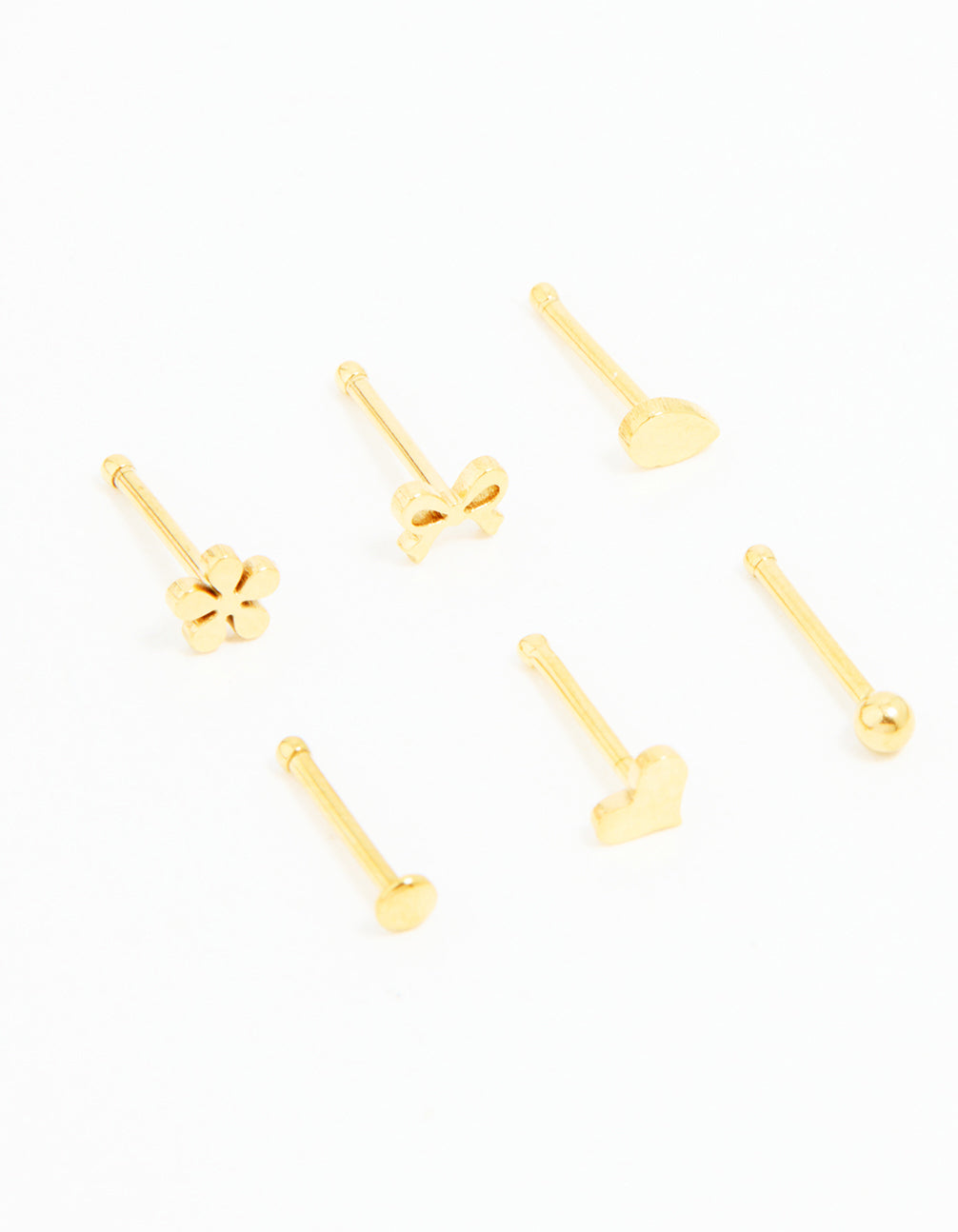 Gold Plated Surgical Steel Heart, Bow & Flower Nose Stud 6-Pack