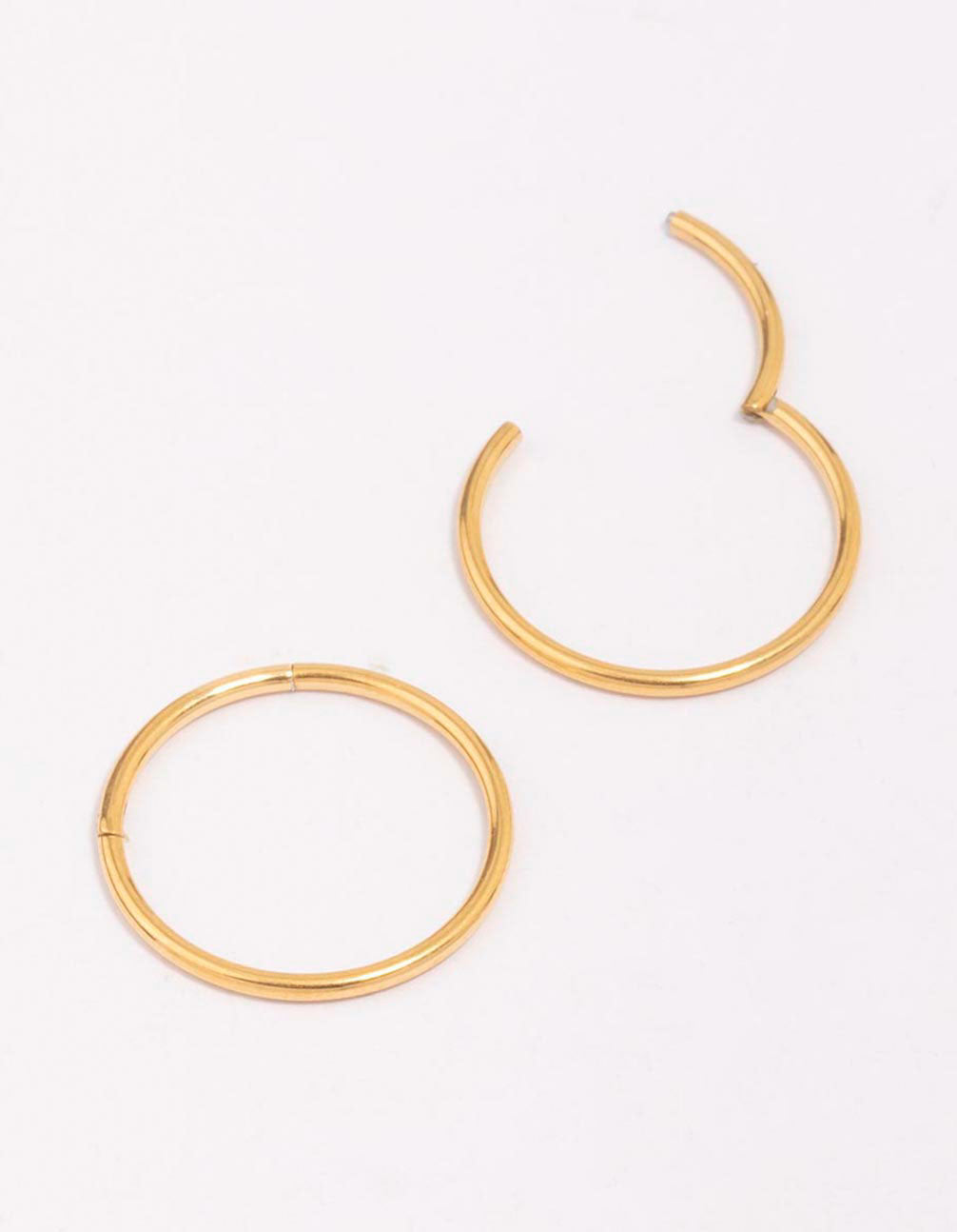 Add a touch of effortless style to your look with these Gold Plated Surgical Steel Sleeper Hoop Earrings 16mm. Crafted from durable surgical steel and finished with a sleek gold plating, these timeless hoop earrings are perfect for everyday wear. The 16mm size strikes just the right balance between subtle and statement, while the hinge back closure makes them super comfy and easy to wear.