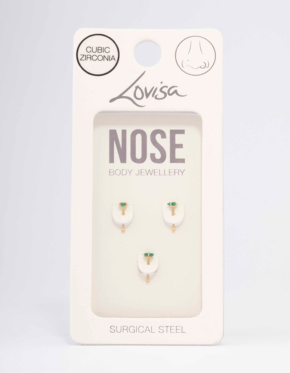 Gold Plated Surgical Steel Emerald Triangular Nose Piercing 3-Pack