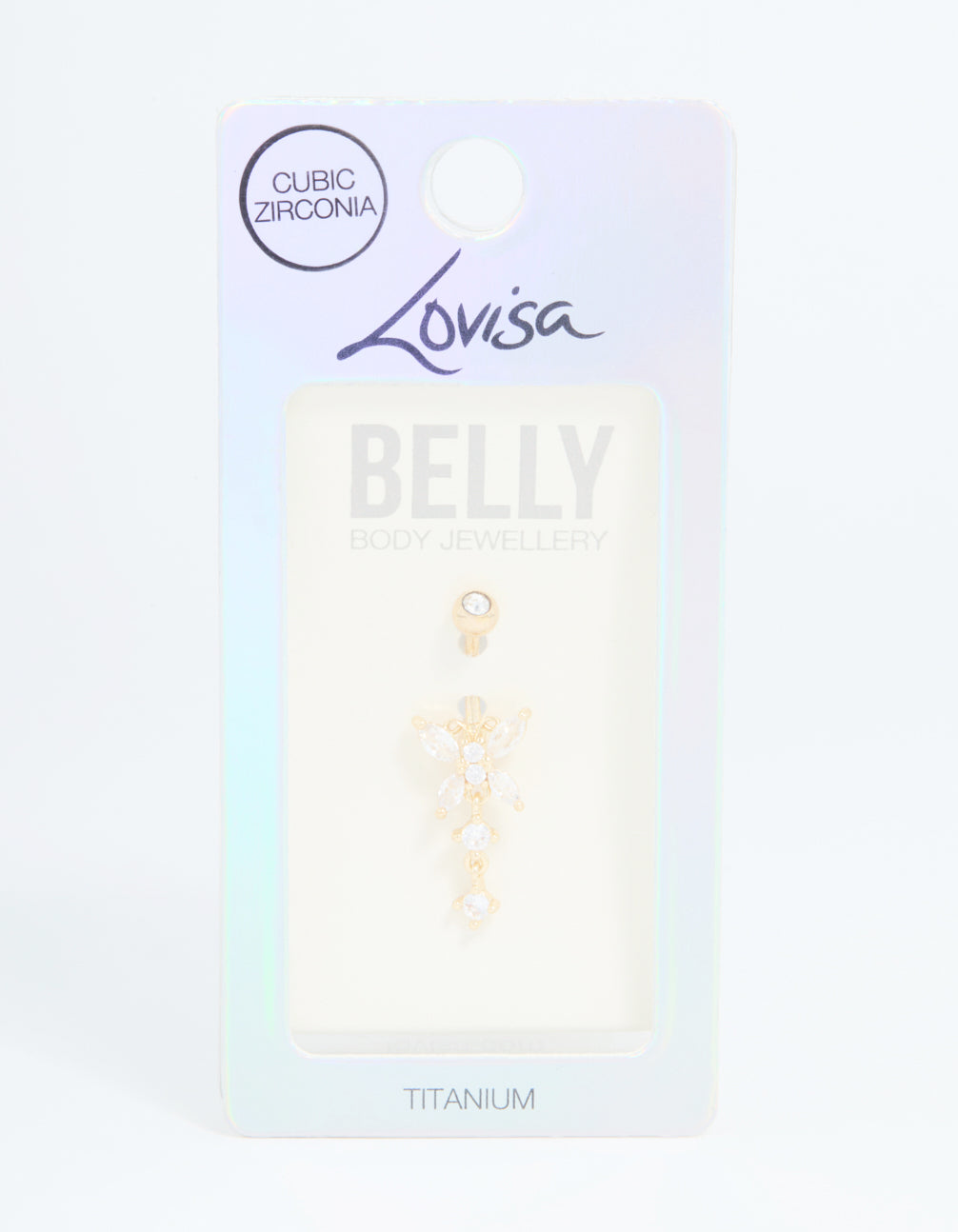 Gold Plated Titanium Cubic Zirconia Butterfly Belly Bar