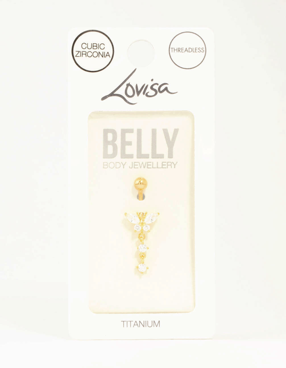 Gold Plated Titanium Cubic Zirconia Butterfly Drop Belly Bar