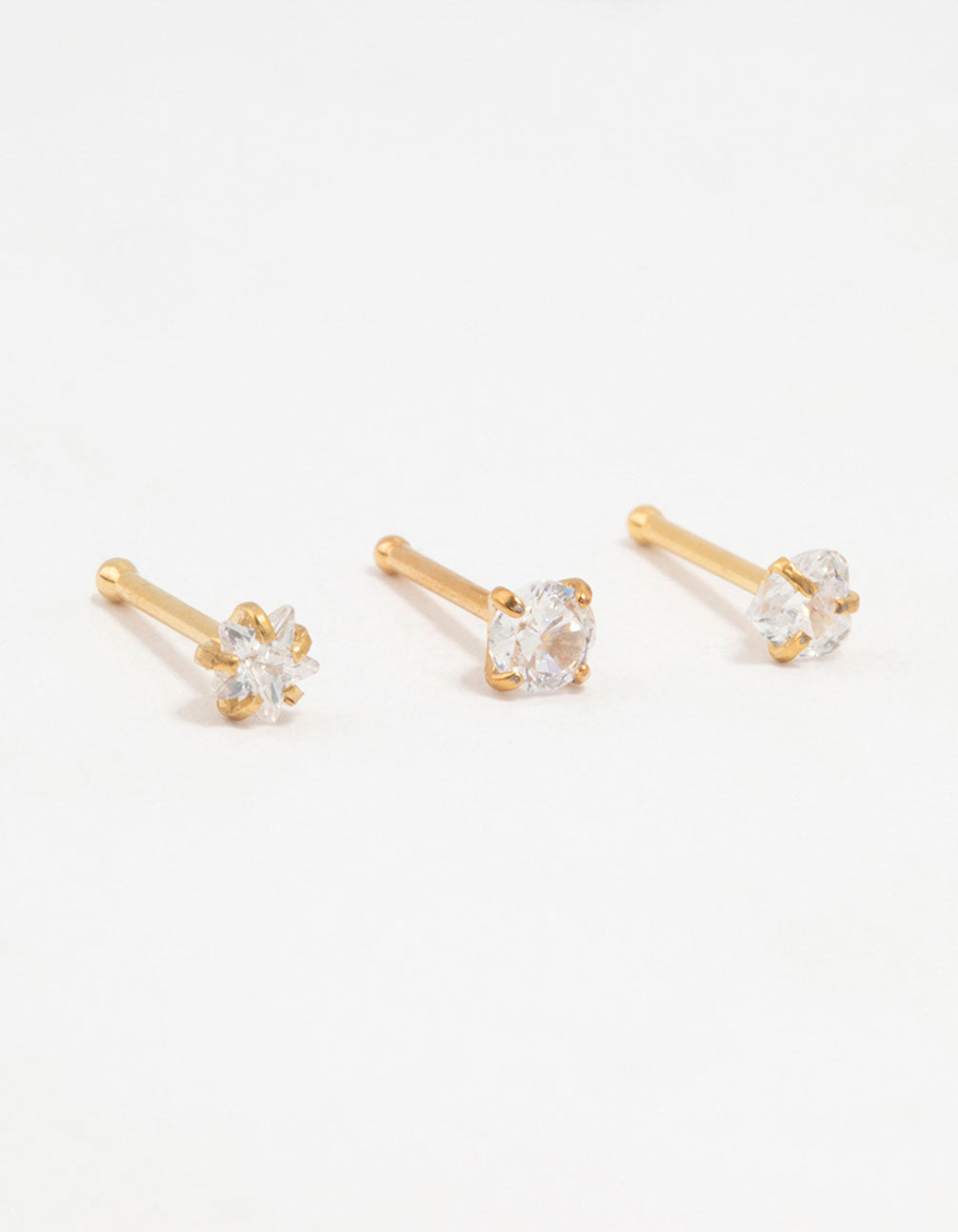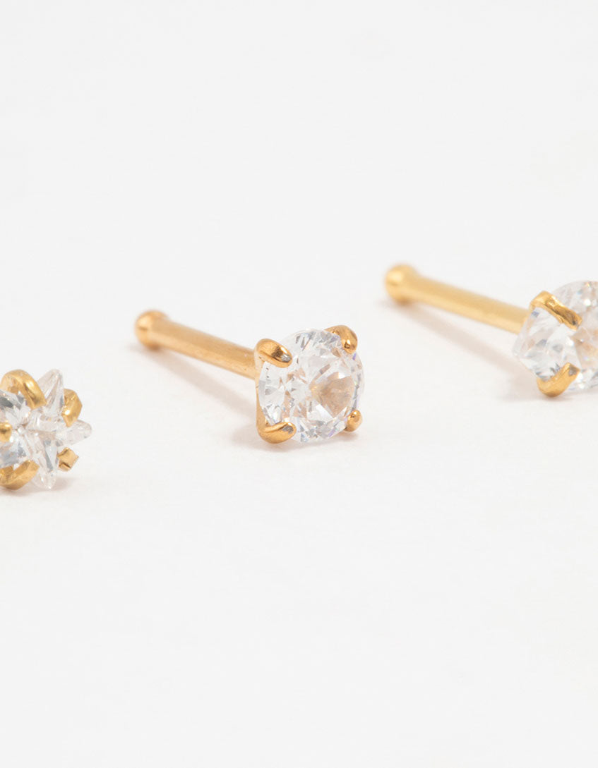 Up your nose game with this trio of gold-plated titanium nose studs, each featuring cubic zirconia that graduates in size for a chic, customizable look. This titanium base is long lasting , while the sparkling stones add an eye-catching look.