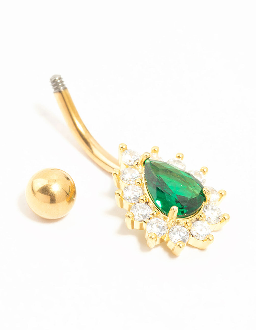 This gold-plated, hypoallergenic belly bar features a unique spikey and pear shaped green cubic zirconia design. Great for a vibrant touch to your look.