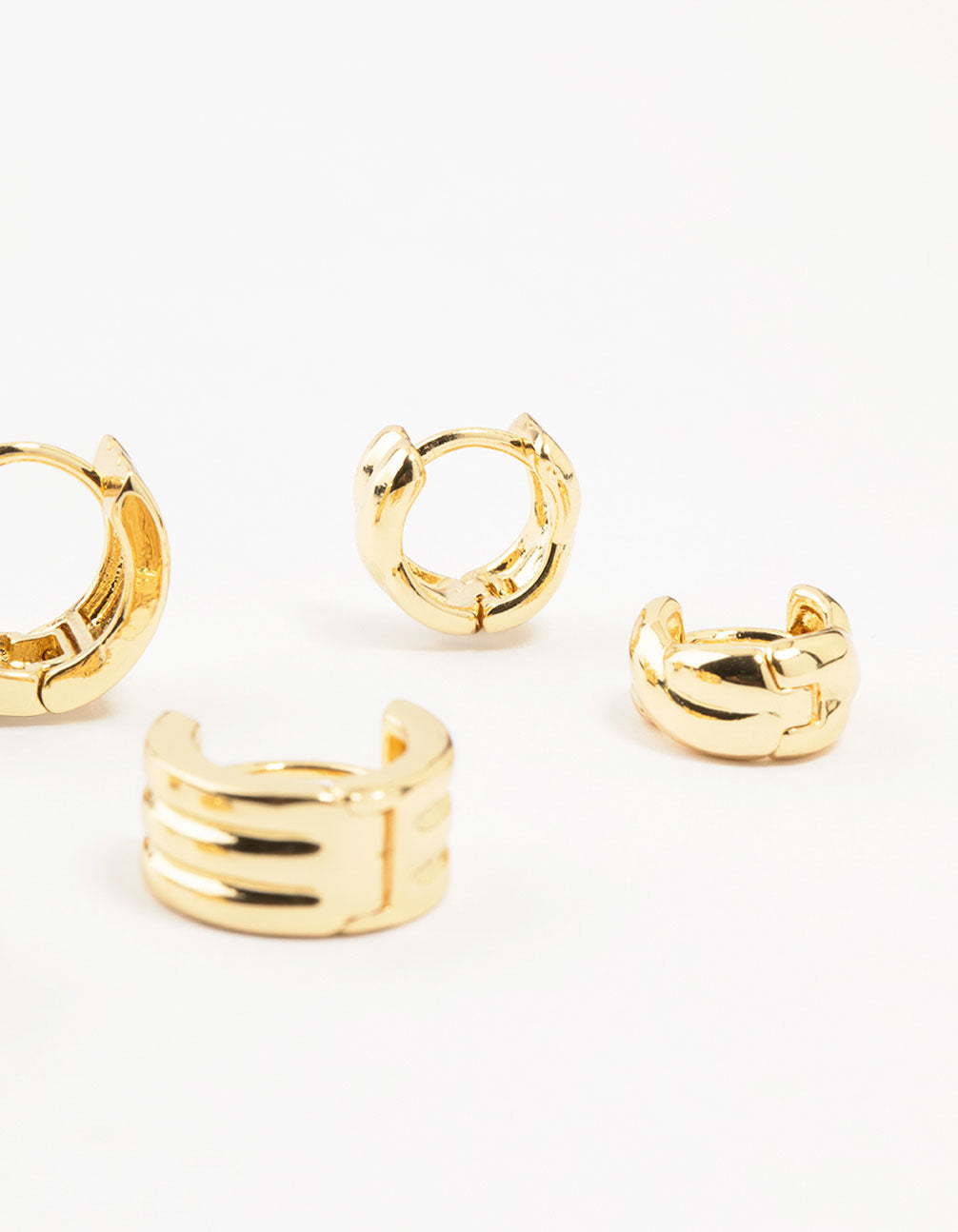 Upgrade your look with this captivating trio of gold-plated earrings. Featuring a blend of ribbed and rope textures, these stacked stunners add a touch of modern sophistication to any ensemble. Pair them with your favorite outfits for a chic finish.