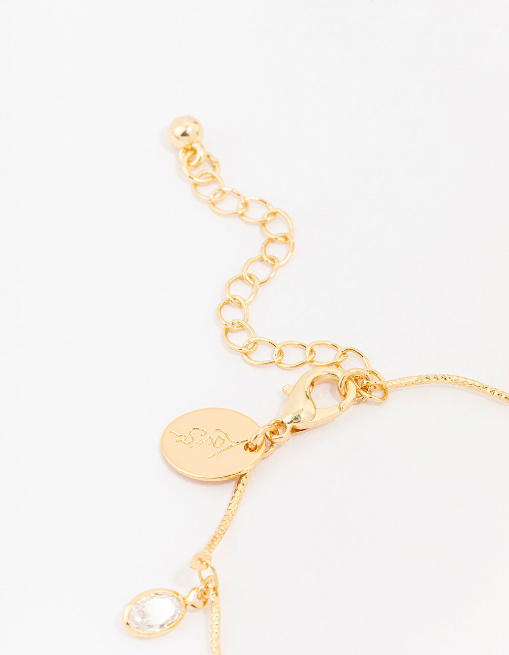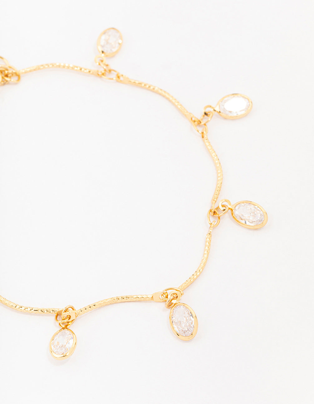 This dainty chain bracelet is plated with gold with a brass baseand dotted with mini cubic zirconia charms.