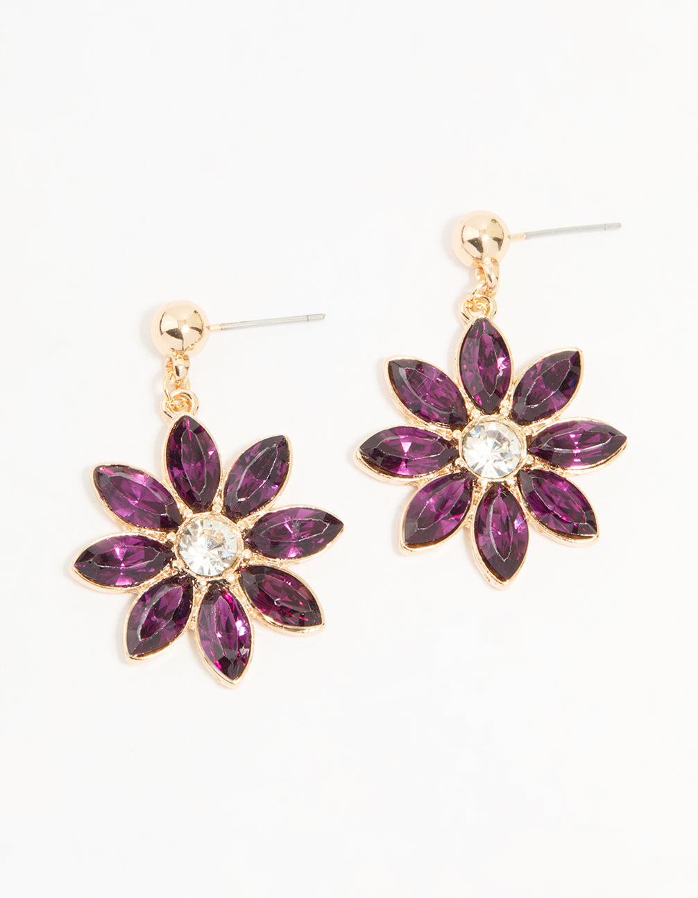 Turn heads with these Gold Purple Diamante Flower Drop Earrings. These drop earrings feature a delicate flower design accented with shimmering purple diamante stones, all set against a radiant gold finish. Ideal for adding a touch of sparkle to any outfit, these earrings bring a fresh, youthful vibe to your jewellery collection. Whether you're heading to a wedding, a party, or a fancy dinner, these statement earrings are the ultimate accessory. Pair them with a flowing maxi dress for a romantic look or with a sleek blazer for a modern, polished finish. Their versatile style makes them a must-have for anyone who loves chic yet playful jewellery that stands out. Perfect for those moments when you want to shine!