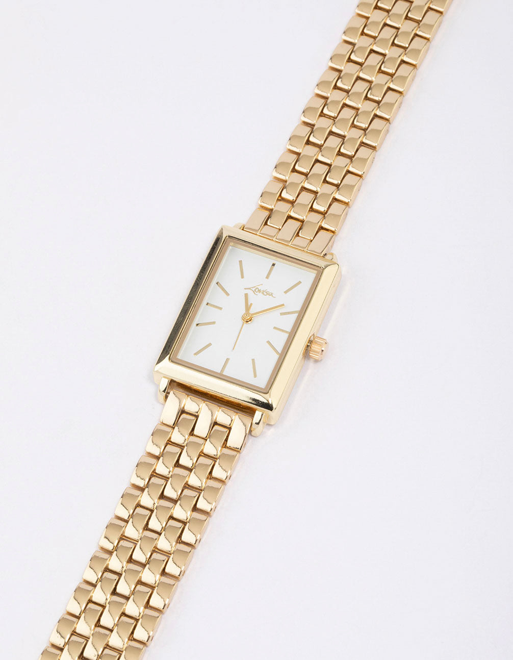 This gold watch features a vintage-inspired rectangular face and woven chain design for a refined look. Pair this watch with matching gold bracelets for a personalised touch.