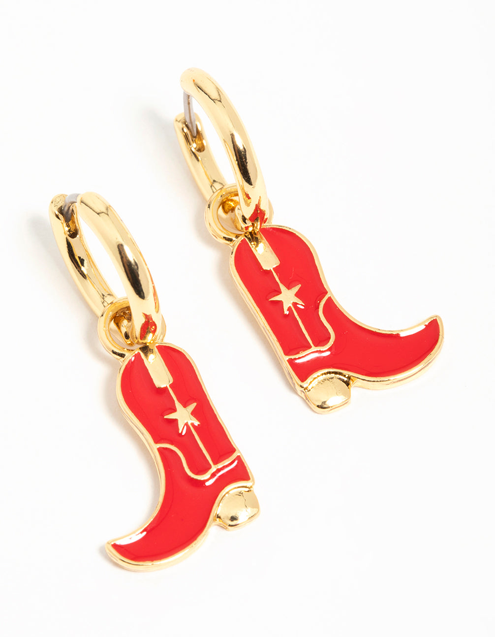 Gold Plated Red Enamel Cowboy Boot Drop Earrings