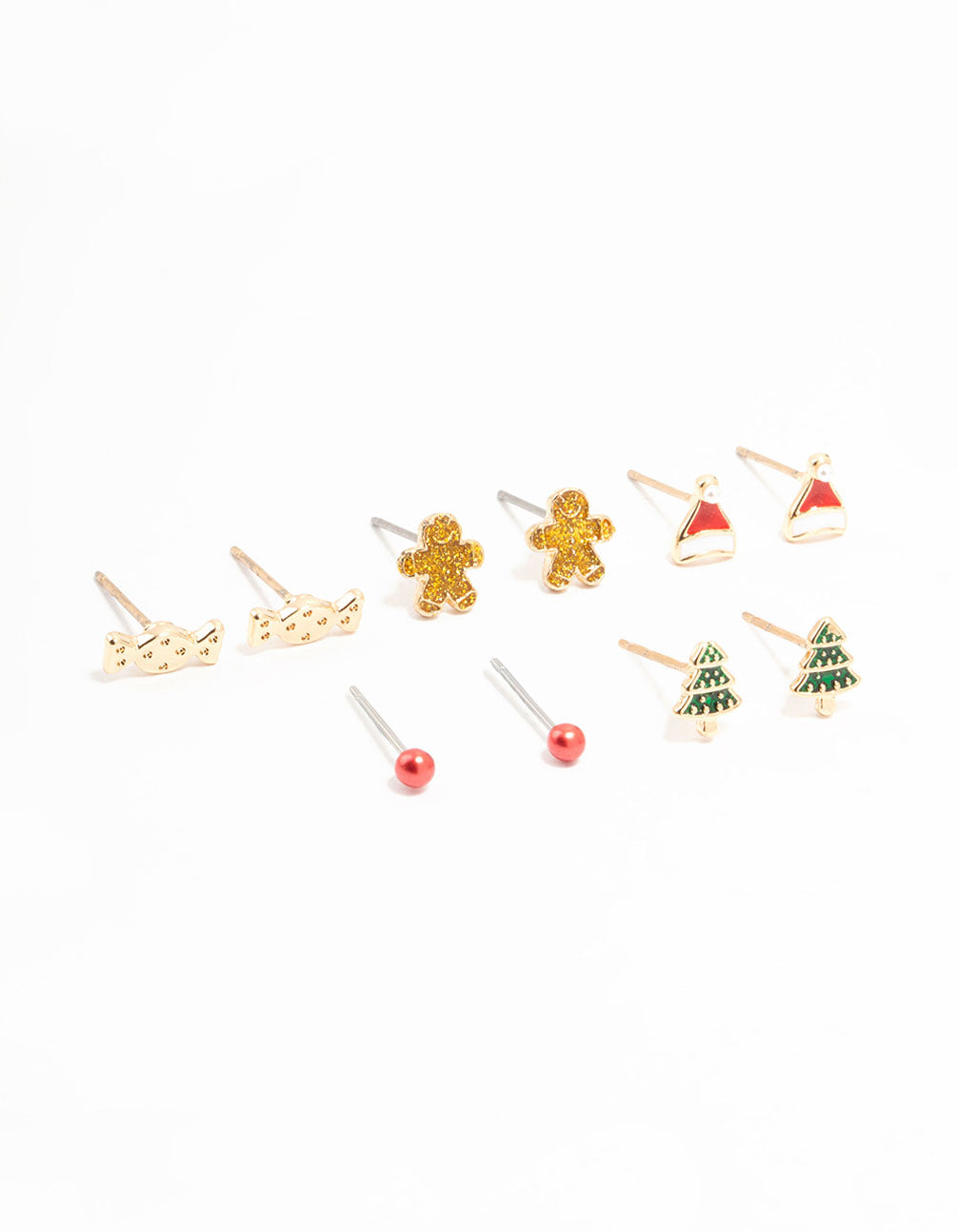 Get ready to sleigh your festive look with this Gold Red Santa Hat & Gingerbread Men Stud Earrings Pack! This adorable set of stud earrings is perfect for adding a playful touch to any outfit. Featuring five pairs, you'll get gold candy studs, cute gingerbread men, Santa hat studs, red ball studs, and green festive tree studs. Each pair is beautifully detailed with a gold finish, giving them a stylish and fun vibe.
