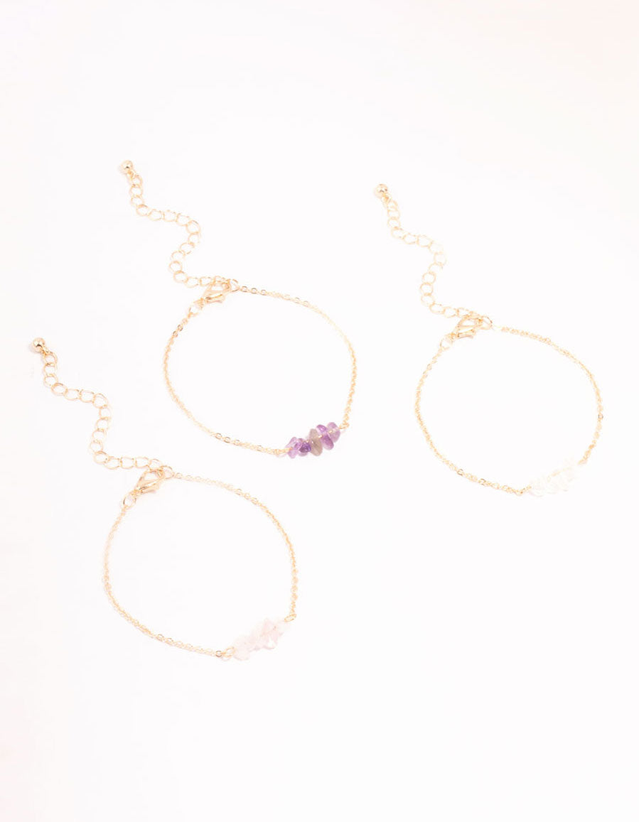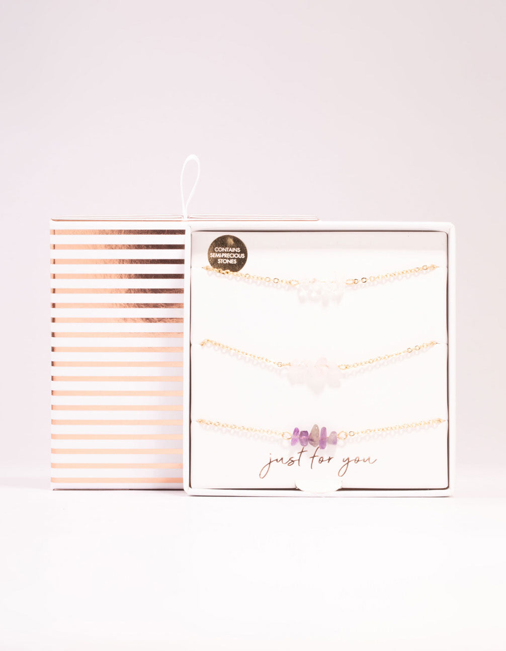 Gift your loved one a set of three semi-precious stone bracelets featuring rose quartz, amethyst, and clear quartz. Known for promoting self-love, healing, and balance, these gemstones help cultivate inner calm and create a stylish wrist stack.