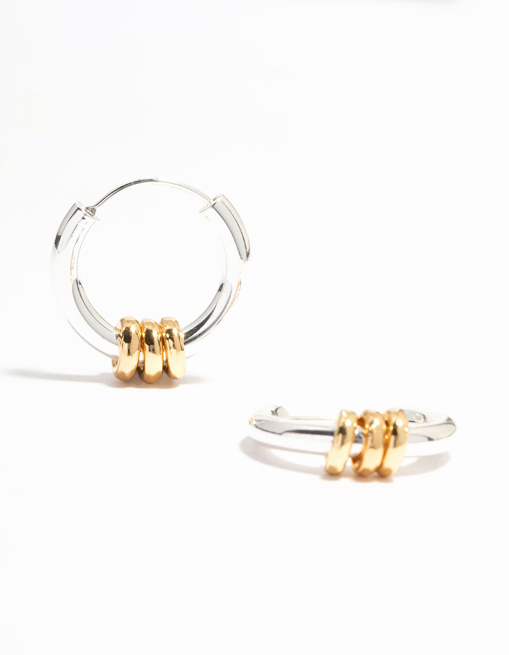Embrace dual tones with these huggie earrings. They are crafted using silver and gold plating for a stylish contrast and feature two mini movable rondell design rings. These are perfect for embracing a cool vibe.