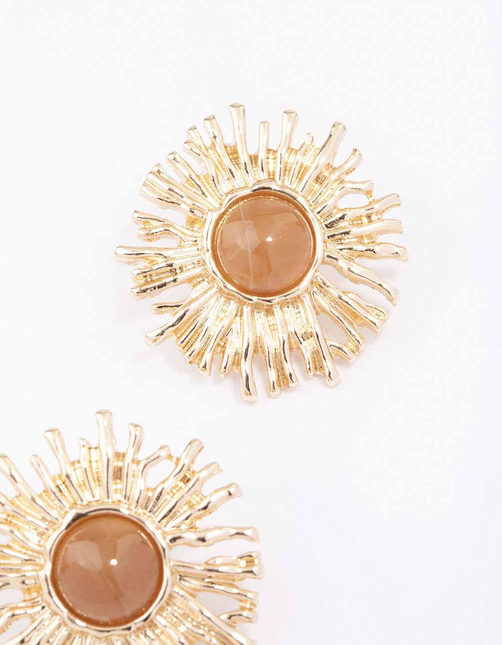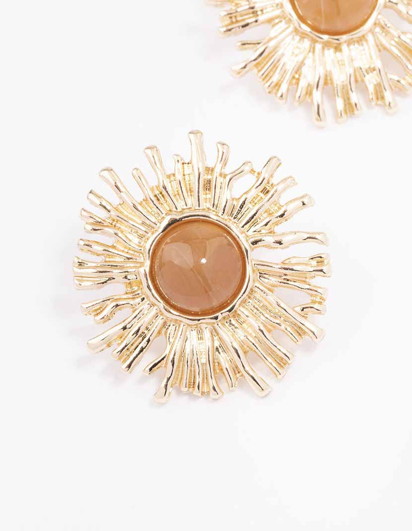 These golden statement studs feature a textured, circular design reminiscent of sunshine.