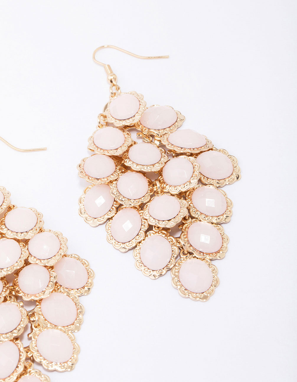Curate your stack with these gorgeous, gold-toned drop earrings. These lovely statement earrings feature a collection of pink, cascading stones. Reminiscent of scales!