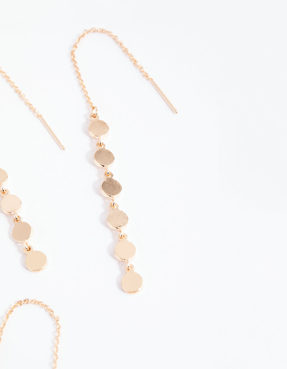 Have you tried thread-through earrings? They gently thread through your piercing and create a layered effect. This set features a disc-chain design, and a circular ring design. Super cute!