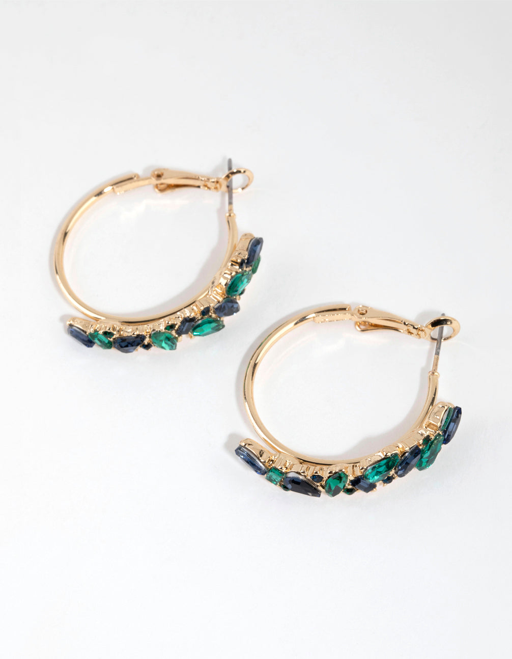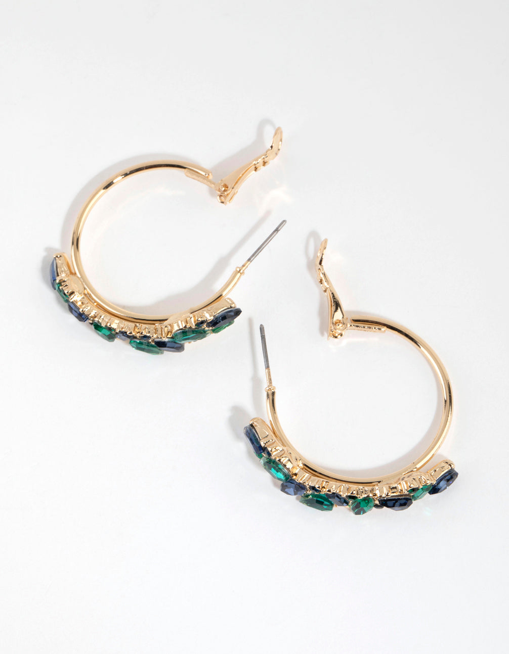 More bling is always a good thing! These stunning hoops earrings boast a diamante embellishments that are sure to get you noticed. They boast a mix of vivid blue and green hues on a gold-toned setting. Wear them to take your outfit to the next level!