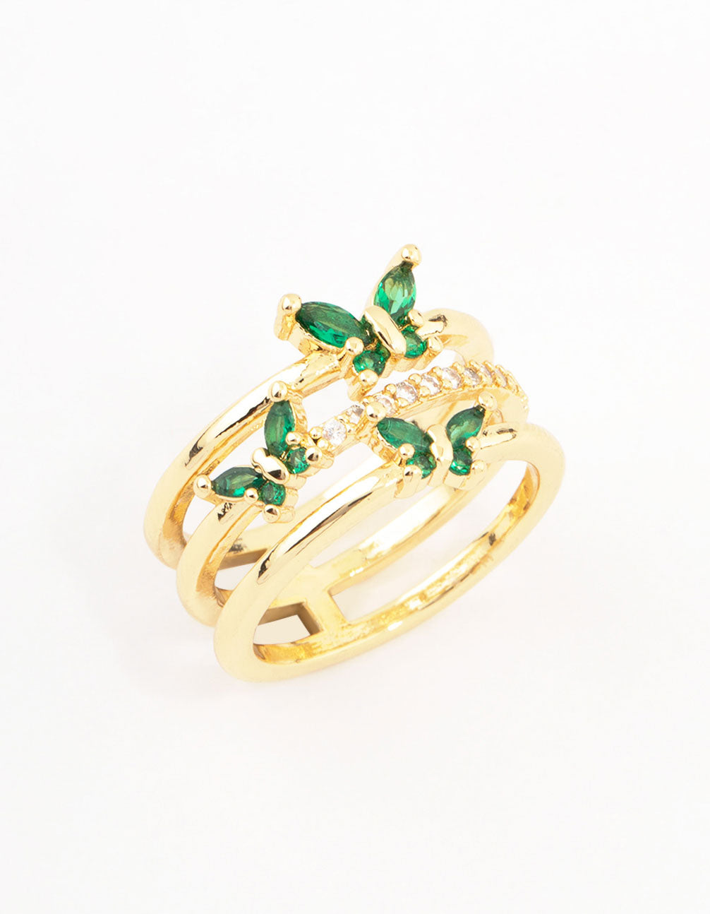 This layered, gold band ring features an assortment of emerald butterflies, perfect for adding a vibrant finish to your stack.