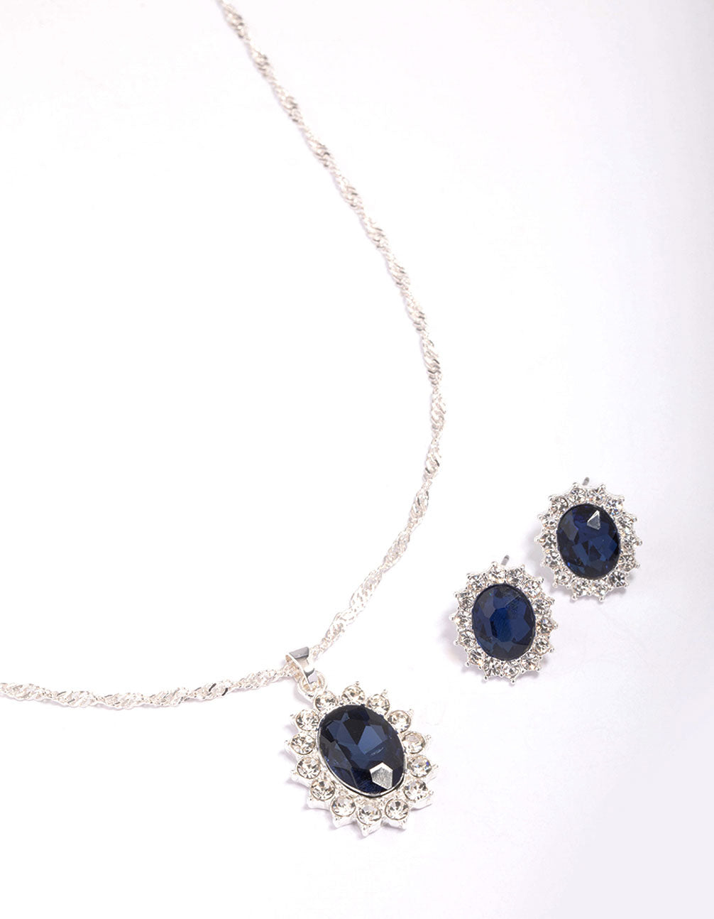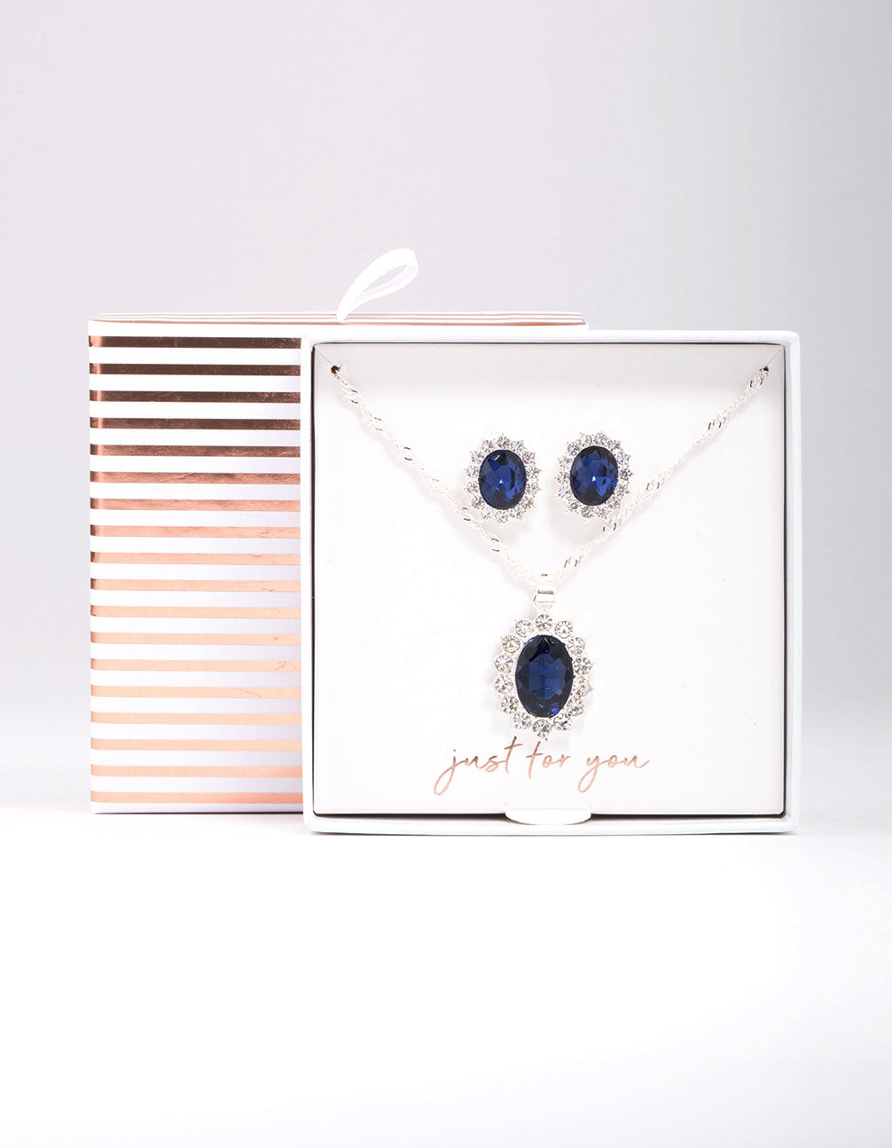 This gift box contains a timeless silver jewellery set adorned with ornate, sapphire embellishments for an old Hollywood inspired look.