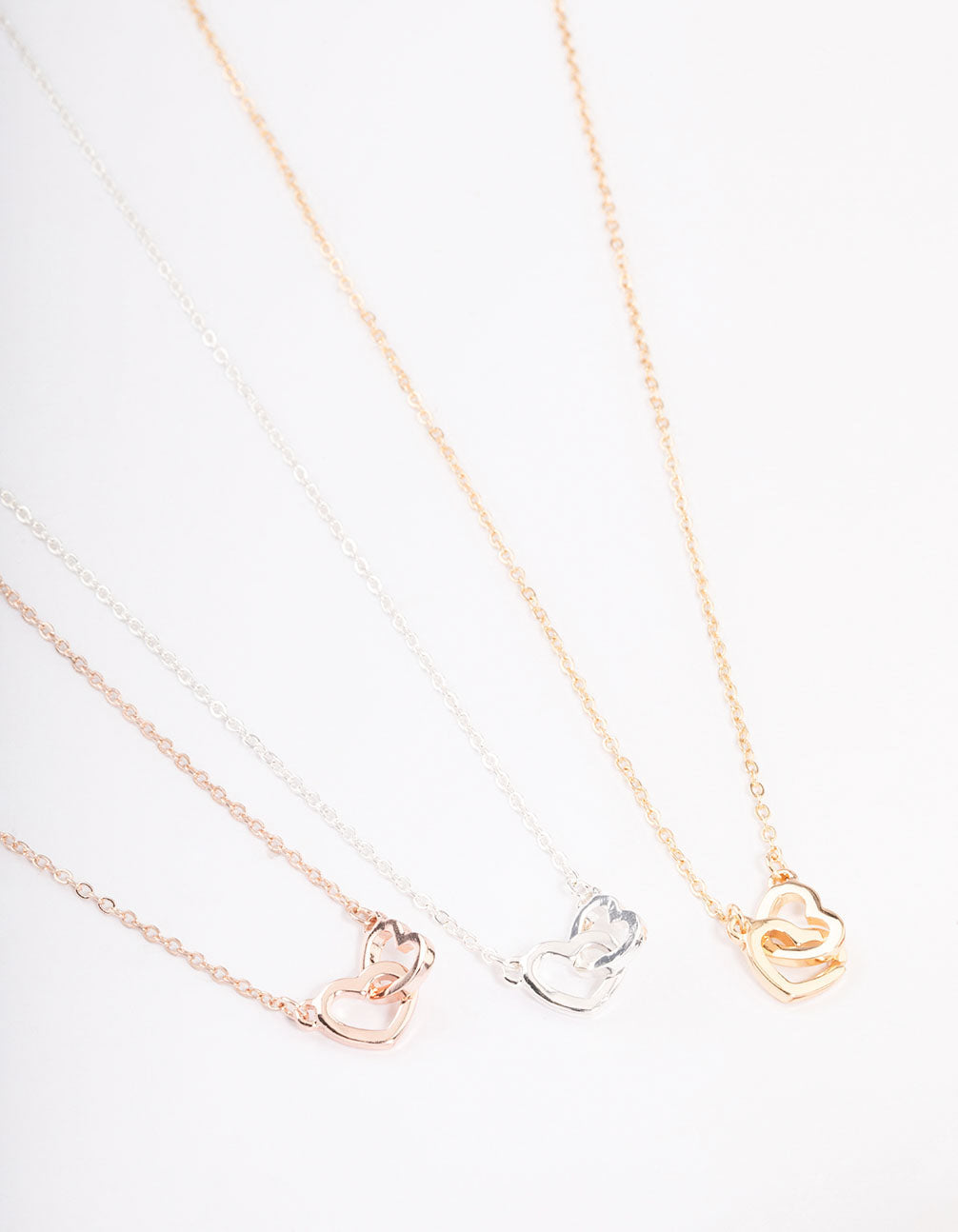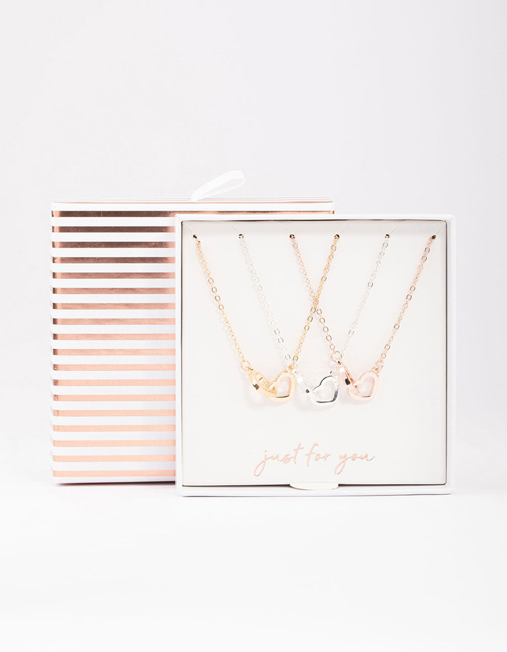 This gift box contains two individual pendant necklaces adorned with interlocked heart charms in gold and silver settings.