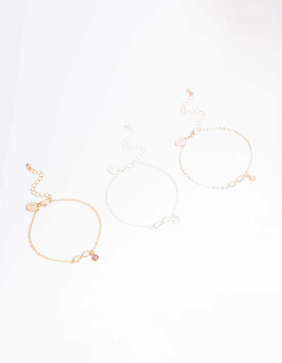 - This gift box contains three individual chain bracelets adorned with infinity charms in silver, gold and rose gold settings.
