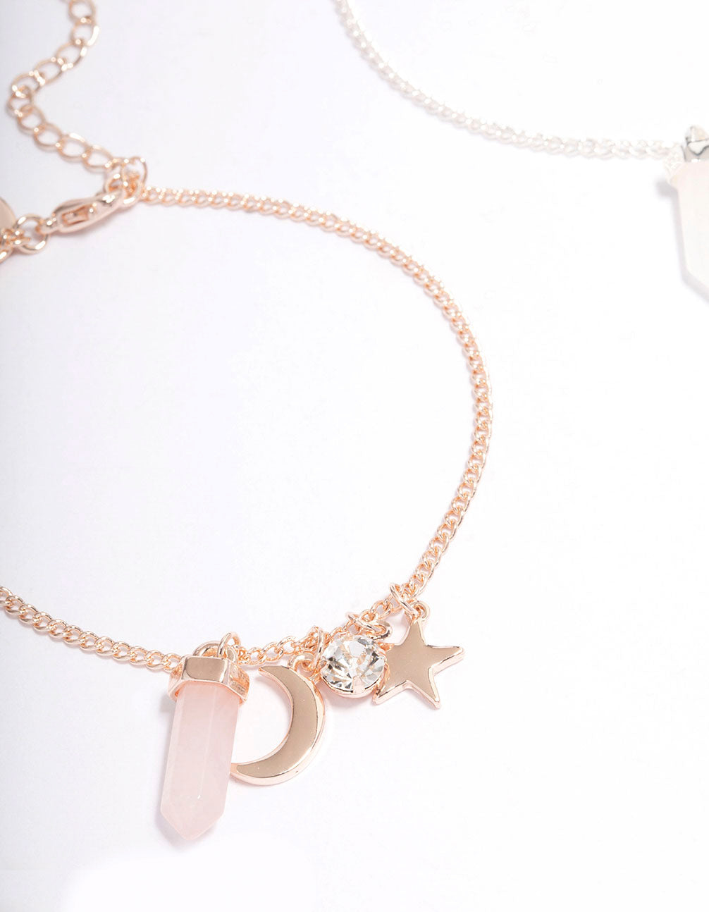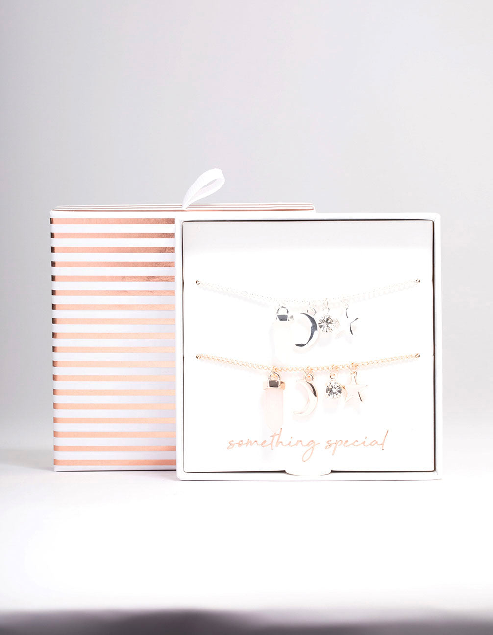 - This gift box contains two individual charm bracelets adorned with celestial-inspired semi-precious charms.