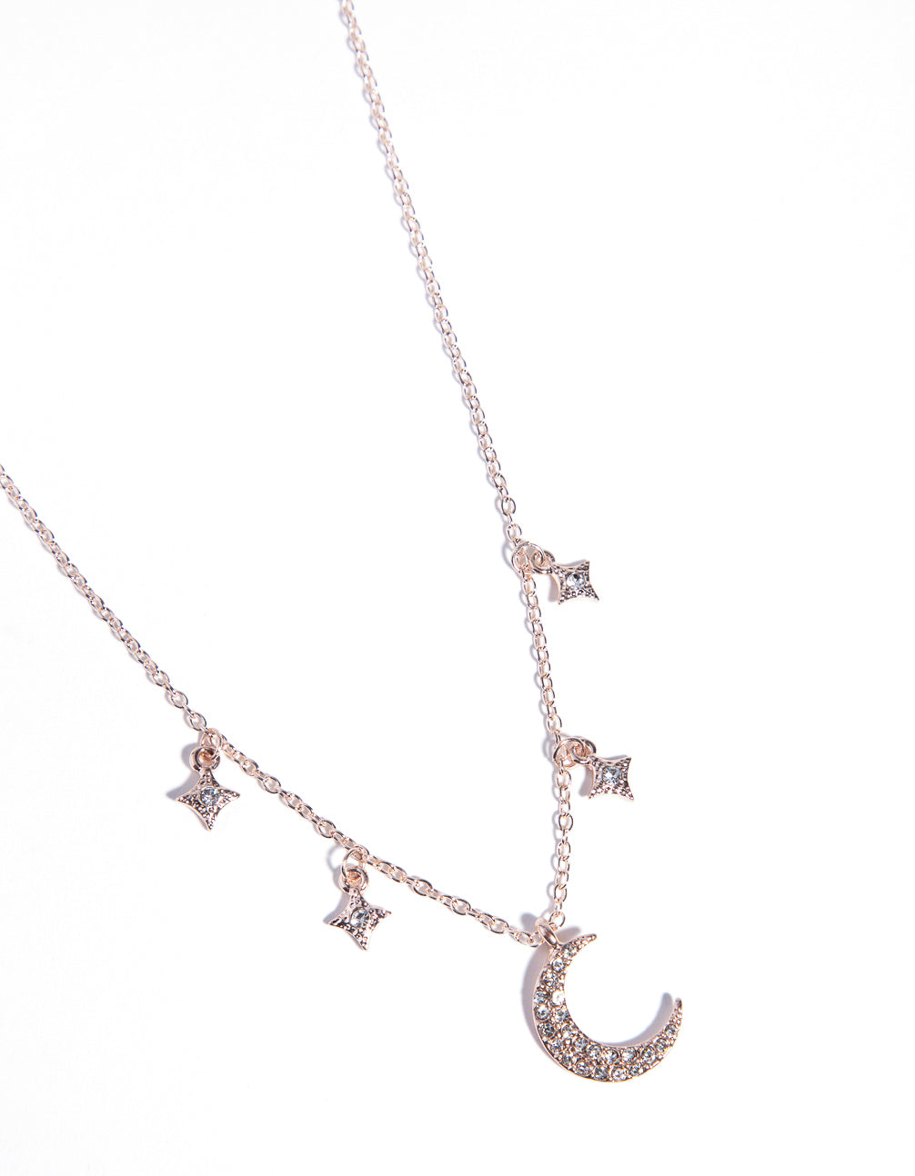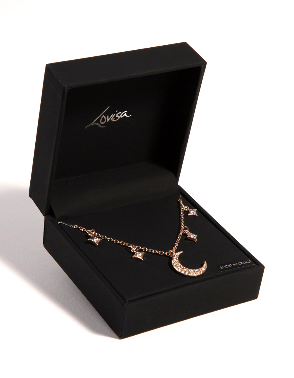Dazzle and shine with eye-catching pieces featuring sparkling elements. This gorgeous rose-gold-toned necklace features a celestial design with glittering star and moon motifs. This piece comes with pair of matching earrings in an elegant black Lovisa box. Gift it to someone special or treat yourself!