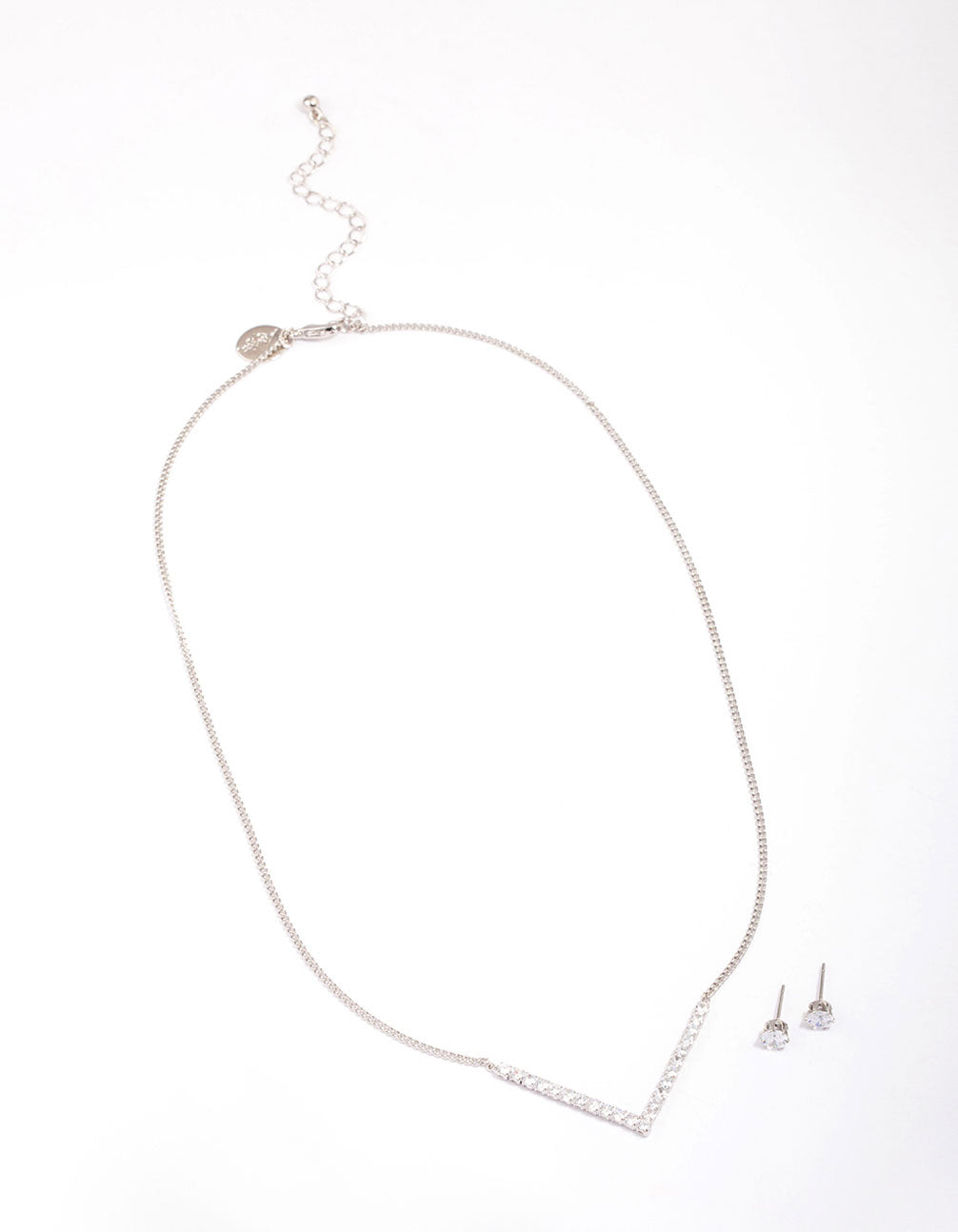 This gift box contains a set of silver-toned studs and V-shaped diamante necklace to match.