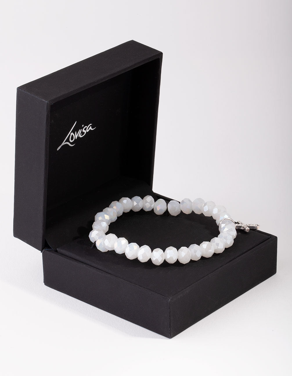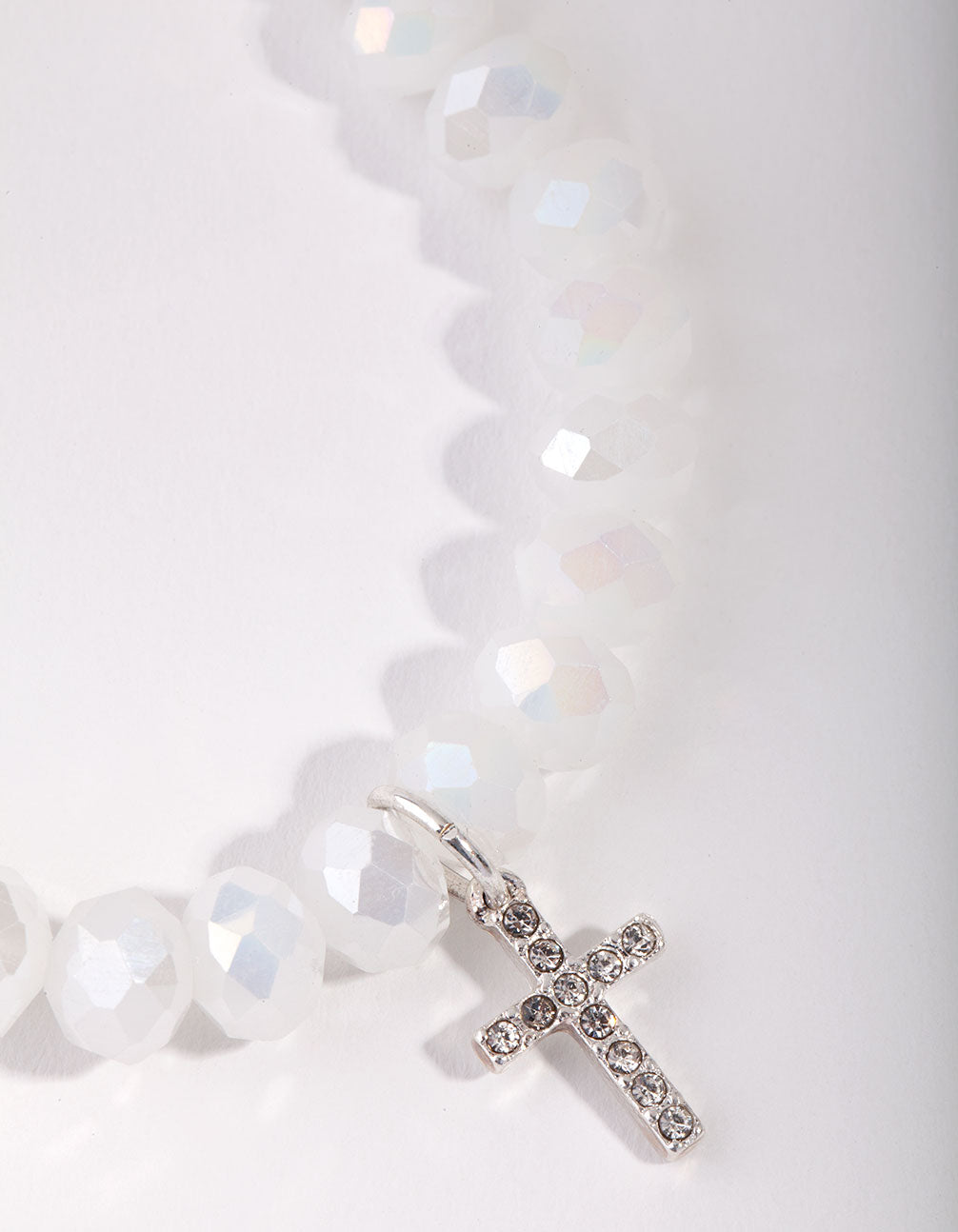 We love a fashion-forward bracelet. This white shiny beaded bracelet has a silver-toned cross charm. Wear it alone or stacked with other bracelets for a dramatic look.