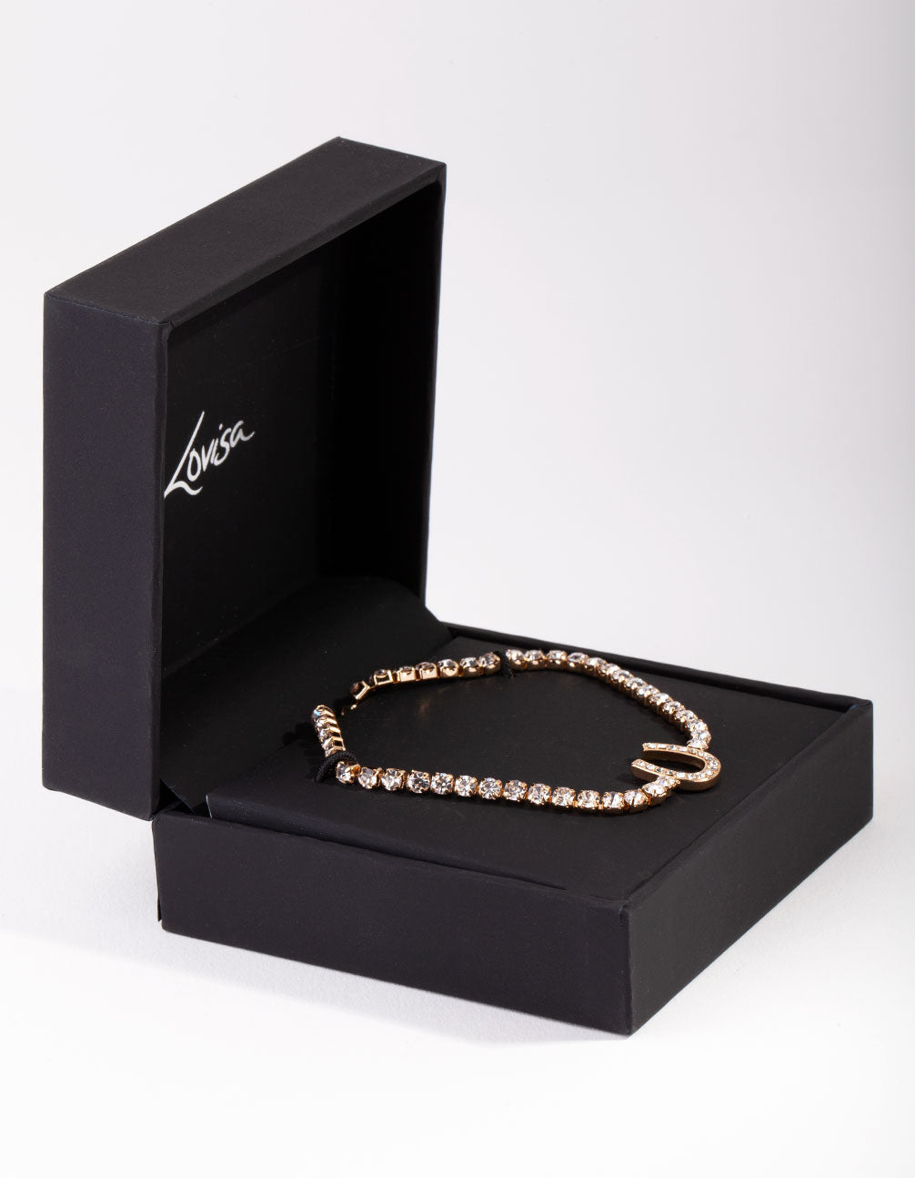 Dazzle and shine with eye-catching pieces featuring sparkling elements. This gorgeous gold-toned bracelet features an adjustable toggle clasp, and a diamante encrusted band with a dangling horseshoe charm. This piece comes with an elegant black Lovisa box. Gift it to someone special or treat yourself!