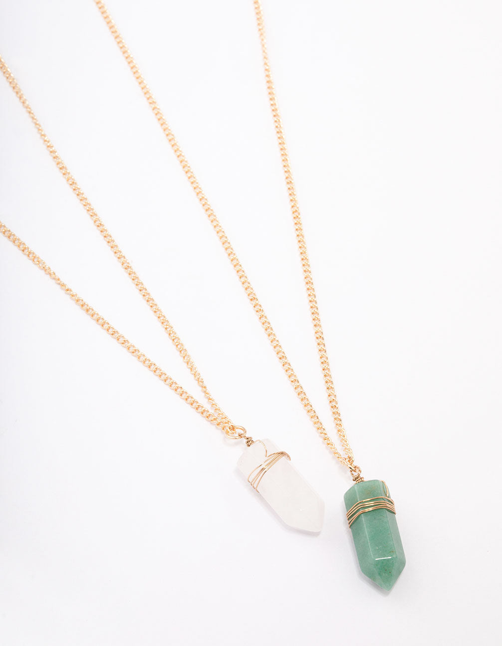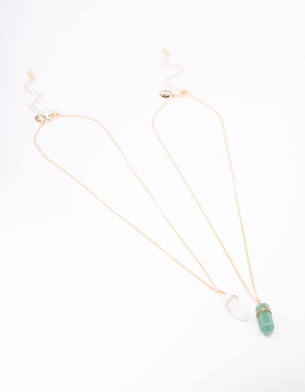 This gift box contains two gold-toned necklaces featuring clear quartz and green fluorite pendants for a natural finish.