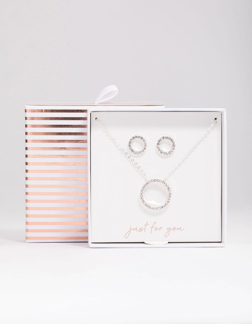 This gift box contains a timeless silver jewellery set adorned with round, open motifs adorned with delicate diamantes.