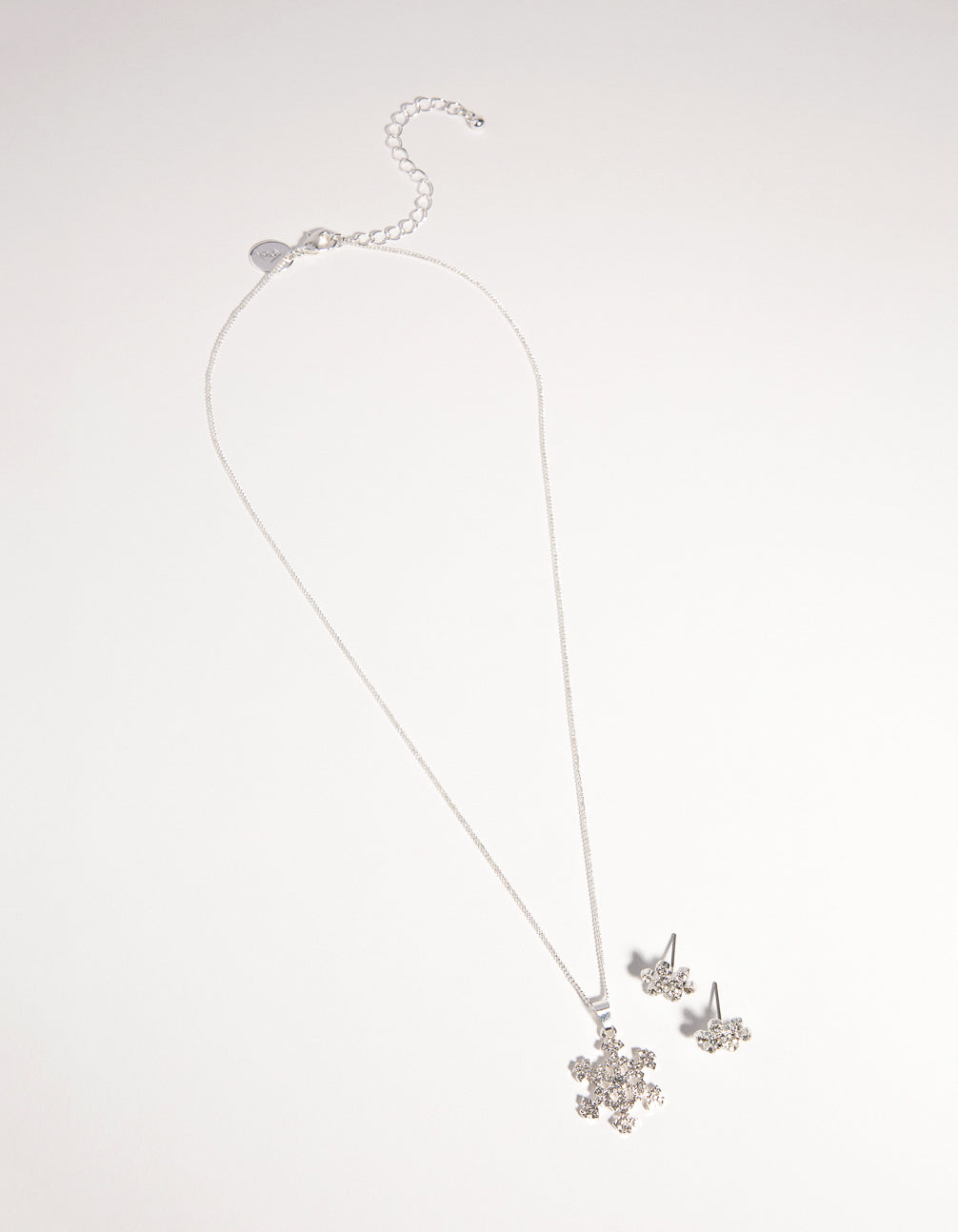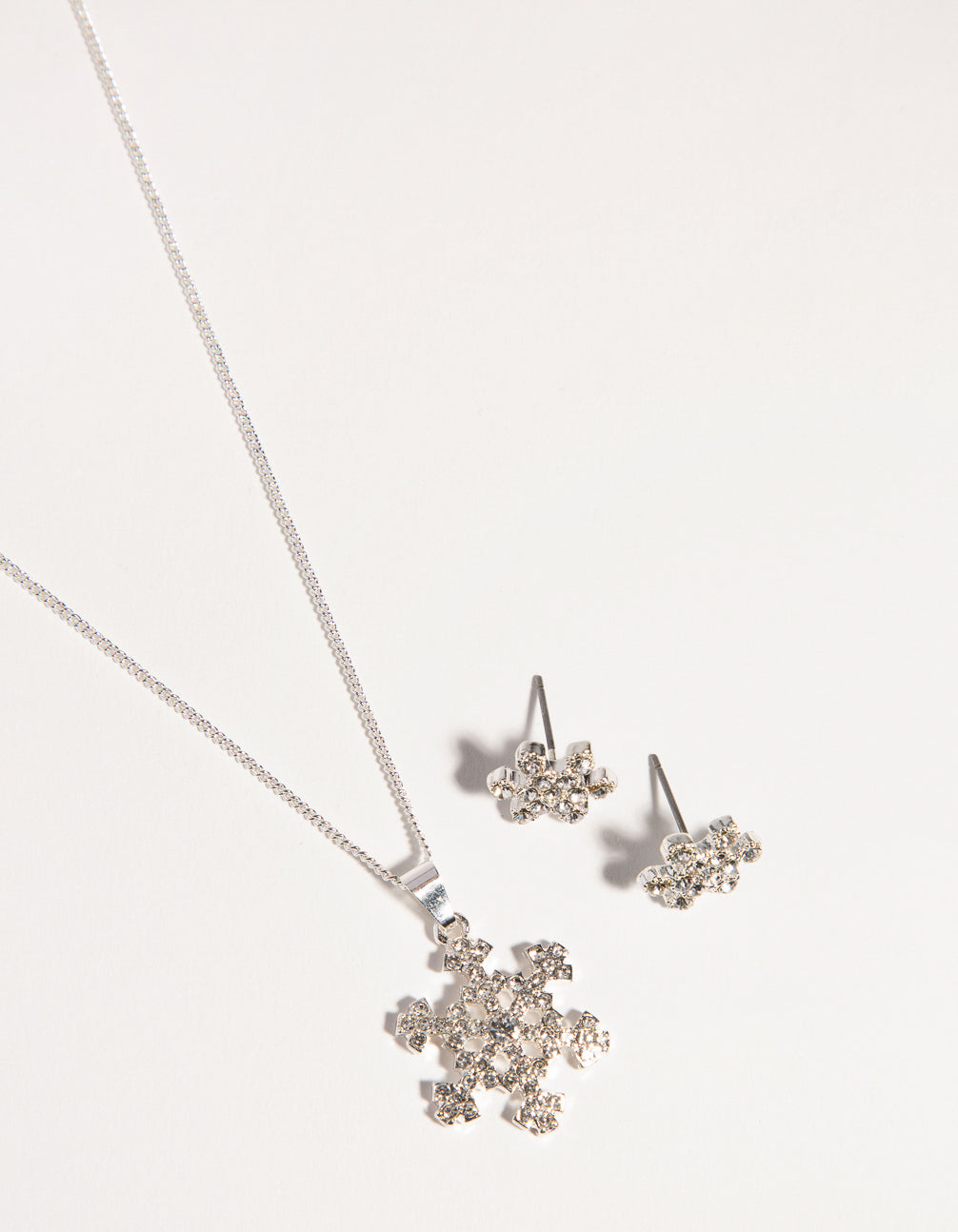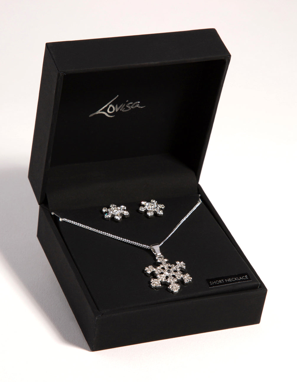 Dazzle and shine with eye-catching pieces featuring sparkling elements. This gorgeous silver-toned necklace features a lovely snowflake design, and the set comes with a matching pair of diamante encrusted earrings that glint like snow. These pieces come in an elegant black Lovisa box. Gift it to someone special or treat yourself!