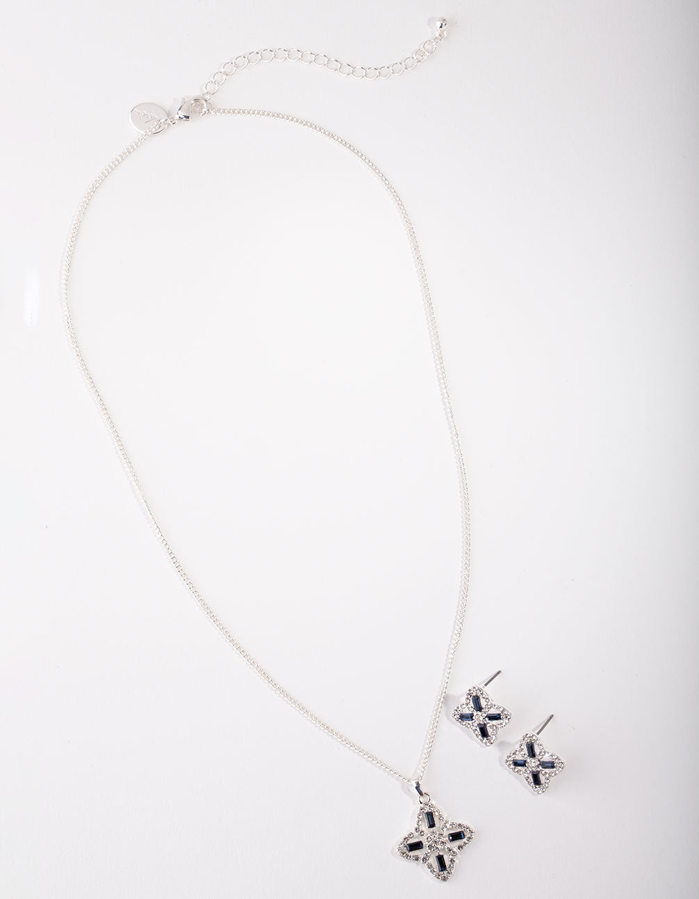 Dazzle and shine with eye-catching pieces featuring sparkling elements. This gorgeous silver-toned necklace features an intricate flower design made up of diamantes and dark navy stones. This piece comes with a matching pair of earrings in an elegant black Lovisa box. Gift it to someone special or treat yourself!