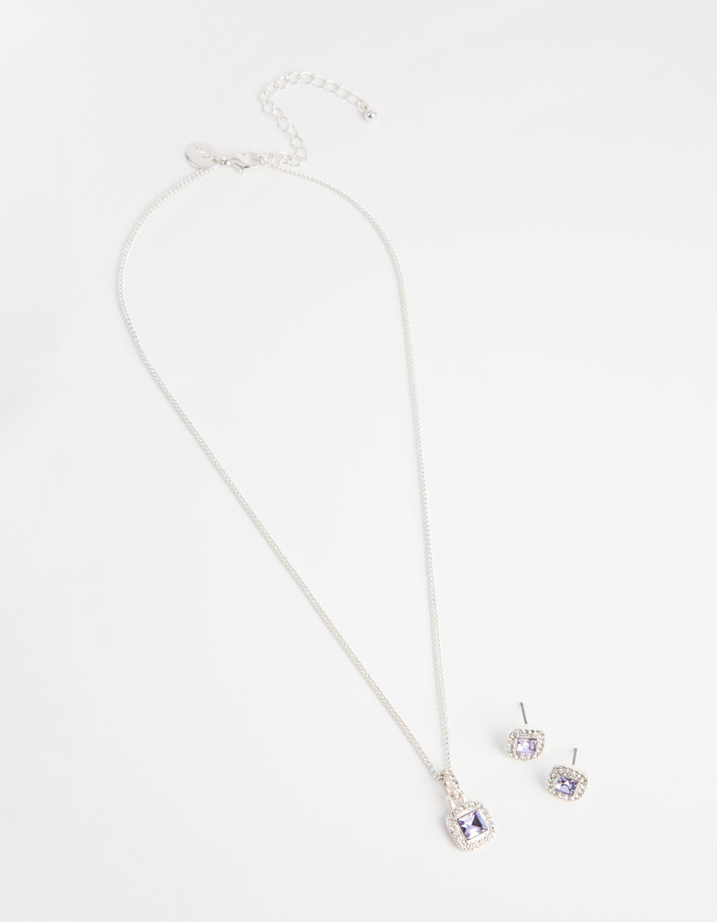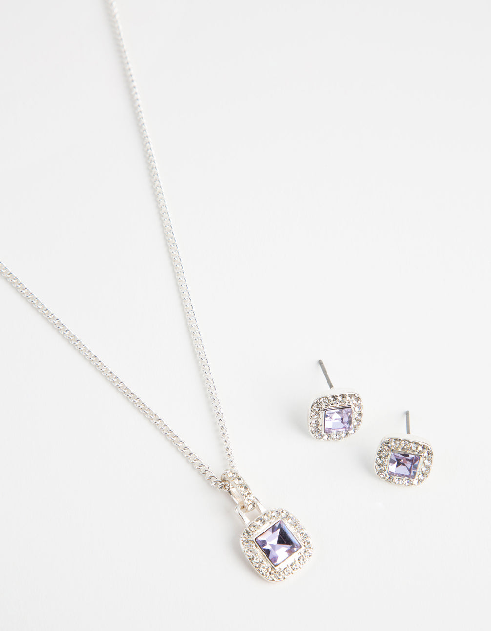 This stunning jewellery set exudes luxury. A silver-toned necklace features a beautiful pendant with a square-cut, amethyst-coloured stone surrounded by diamantes. It comes with matching stud earrings. Show someone special how much they mean to you or treat yourself!