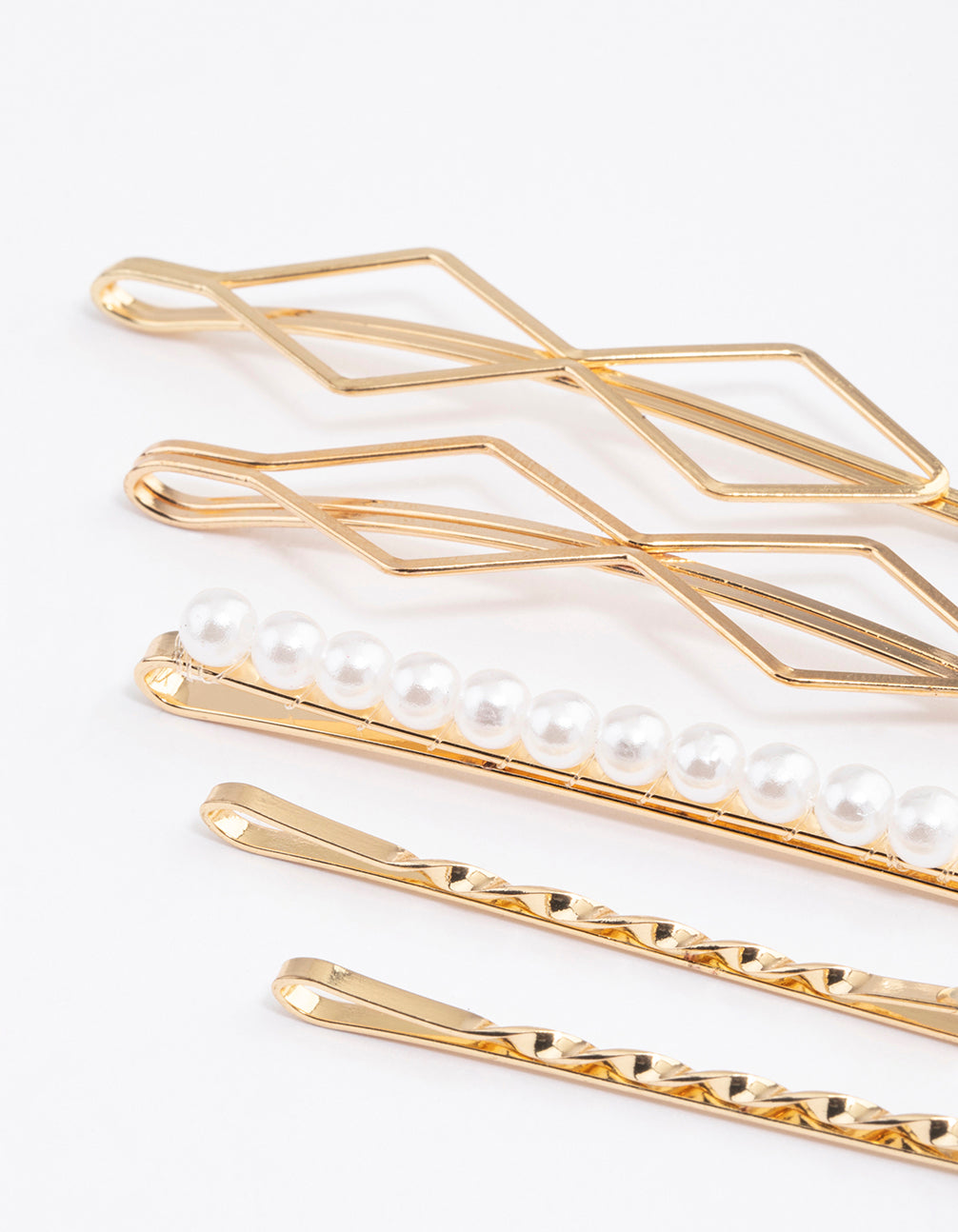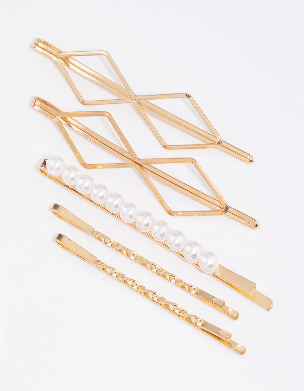 - This hair clip set contains five individual, gold-toned hair clips embellished with unique pearls for an elegant finish to your look.