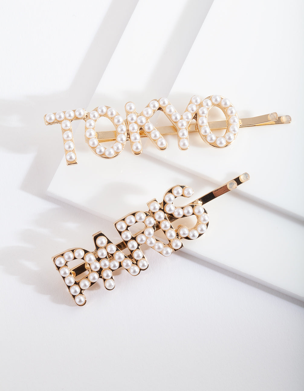 Pearl hair accessories are perfect for those wanting to create a chic & fashion-forward look. These lovely gold-toned clips features a pearl design that spells out 'Paris' & 'Tokyo' for a globe-trotting nod to your travels. Draw attention to your luscious locks with this hair clip pack.