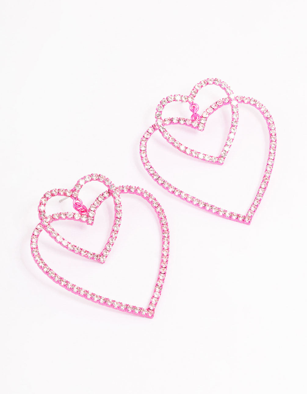 Style the latest Barbie-core trend with these pink heart earrings. These statement earrings feature two diamante-encrusted hearts interlaced for a lovable look. Style them all year round for a pop of pink to your look, or style them at your next Barbie-themed costume party.