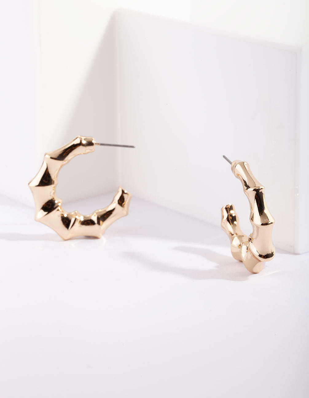 A fun pair of fashion earrings are an easy way to spice up your daily ensembles! Add some colour and experiment with your style! These hoop earrings boat a bamboo shaped design in a gold-tone.