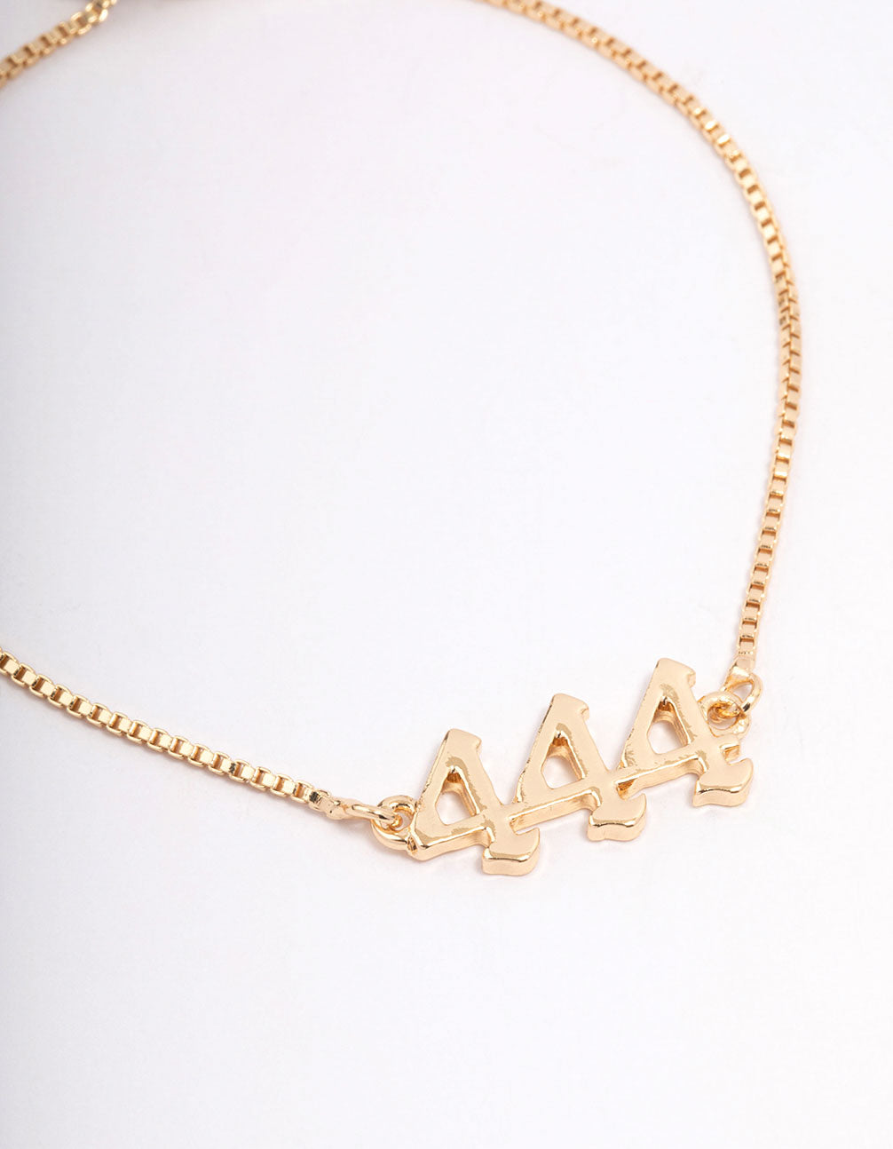 - This signature bracelet is plated with real gold and features a dainty '444' angel number charm. Repetitions of 4 are a symbol of protection! Wear this bracelet each and every day to channel good energy and protection into your life!