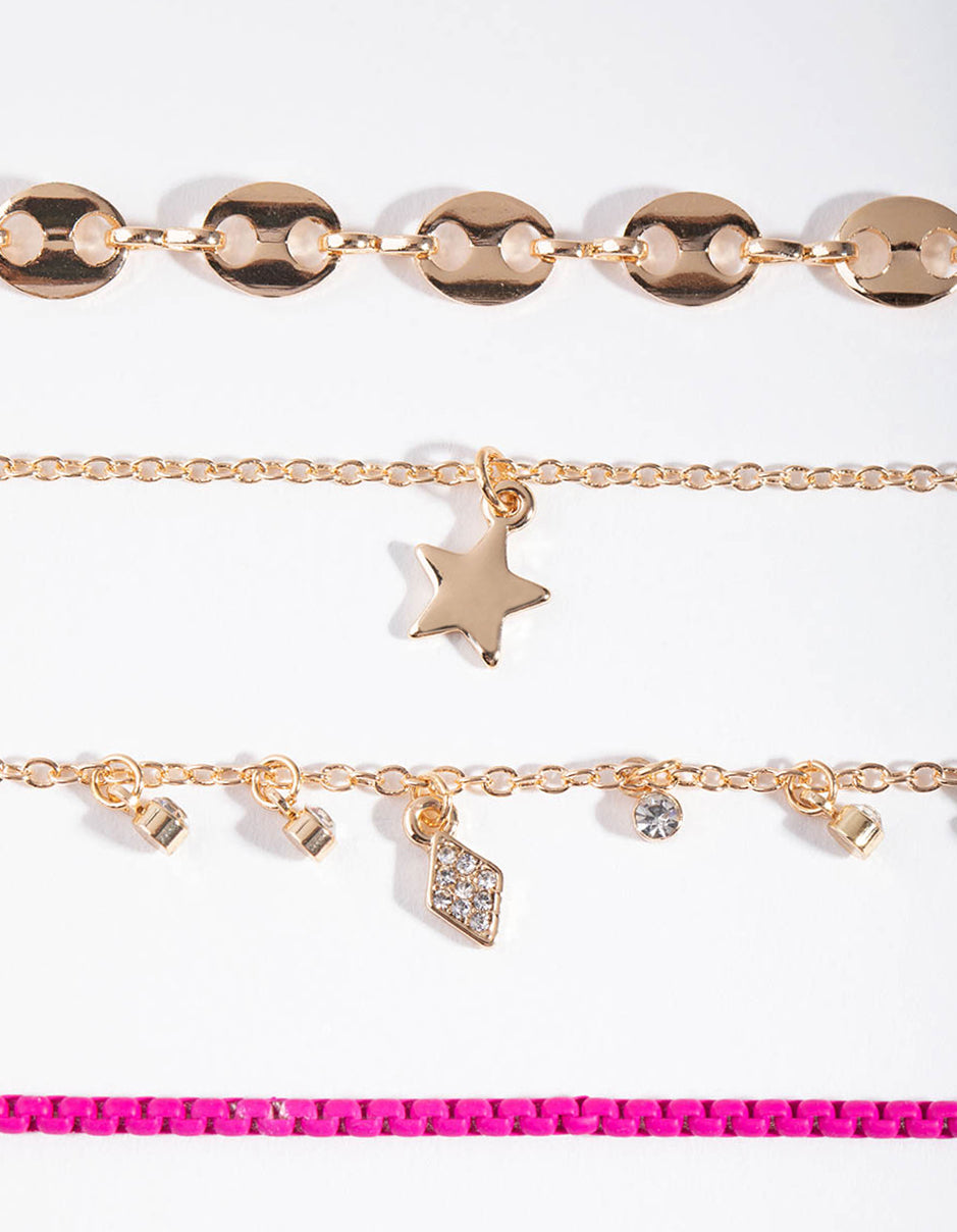 Give your outfit a playful flair with these fun bracelet and anklet pack! The set includes four pieces, one a vivid matte pink and three gold-toned chains. Each has a different design, making them perfect for layering. They can be worn on your wrist on ankle, wear them to complete a funky look!