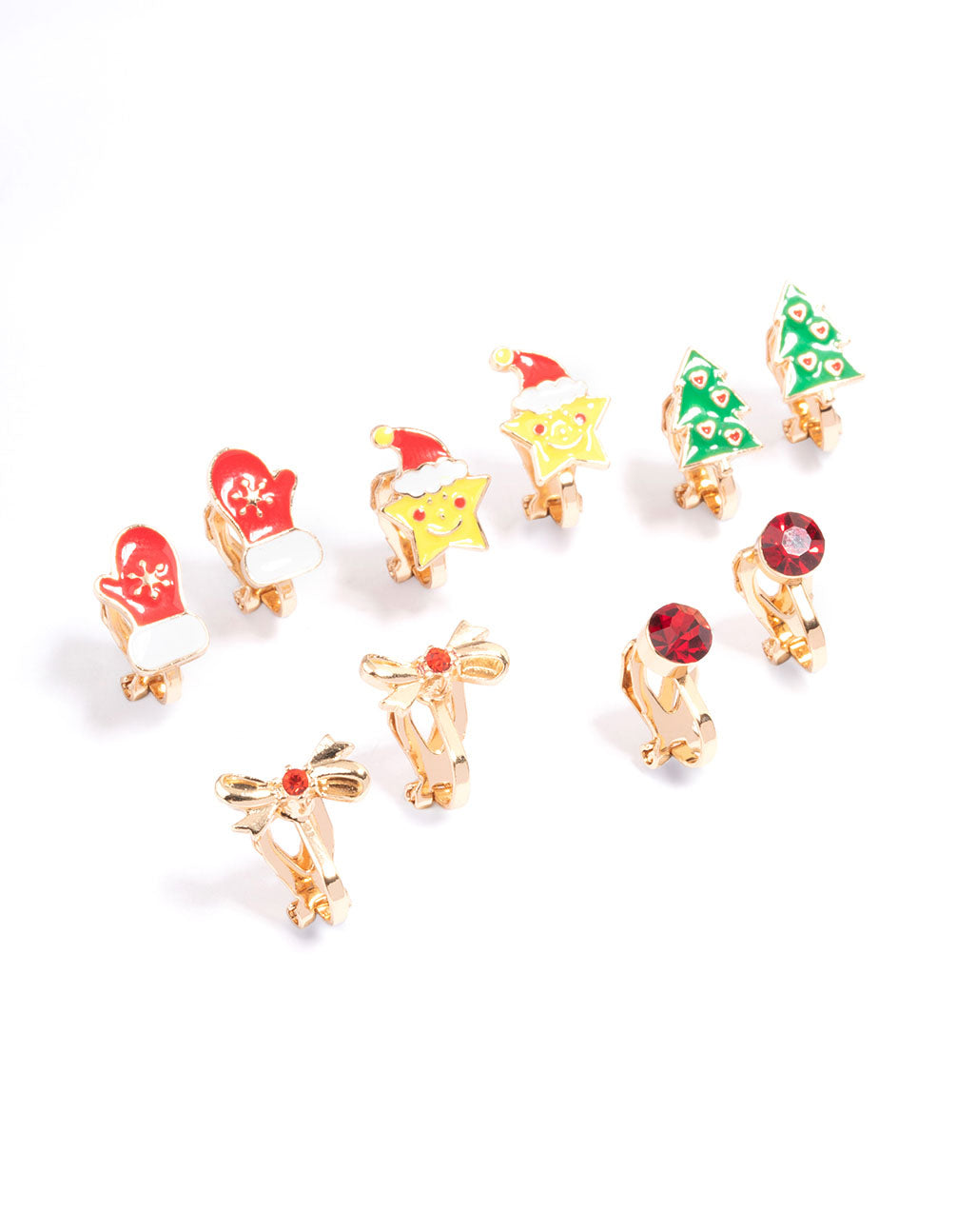 - This five pack of clip on earrings are adorned with adorable Christmas charms, including celestial stars for a festive finish to your stack.