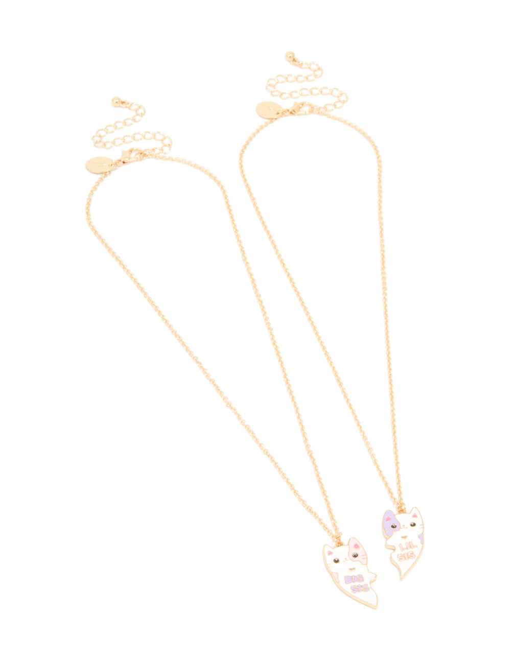 Kids Gold Pink & Purple Hugging Cat Big Sis Little Sis Necklaces Pack