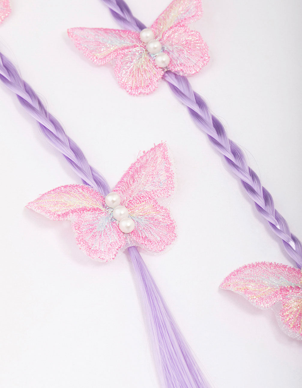 Let your little ones express themselves with this unique set of hair clips, designed with lilac braided hair extensions. These unique strands of faux hair are adorned with glittery butterflies, perfect for adding a pop of colour to your childs hairstyle!