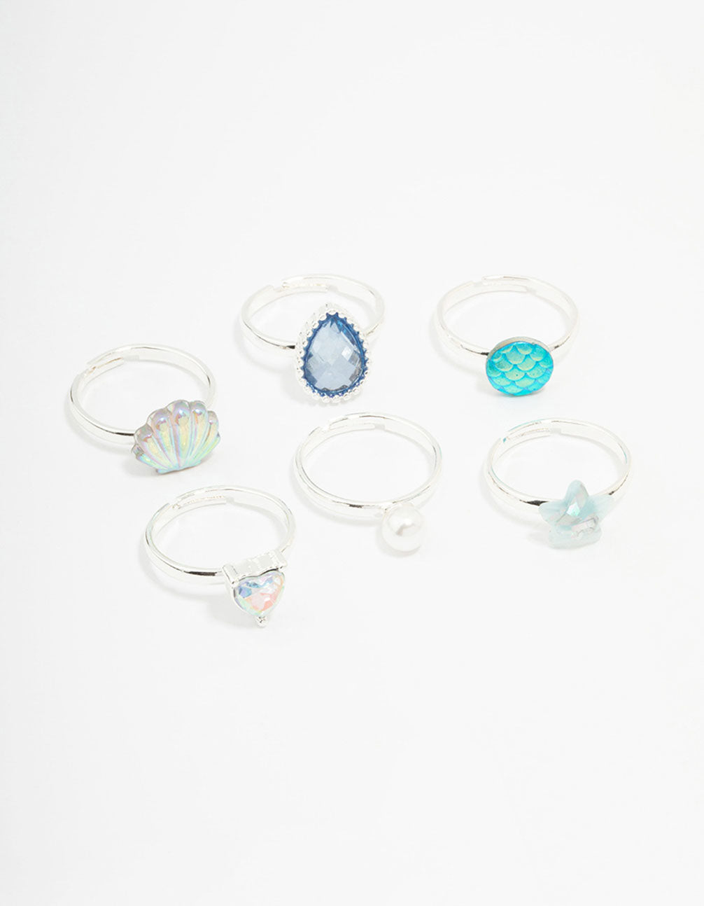 This ring pack includes six silver-toned, adjustable rings. Each adorned with mermaid-inspired charms for a whimsical finish.