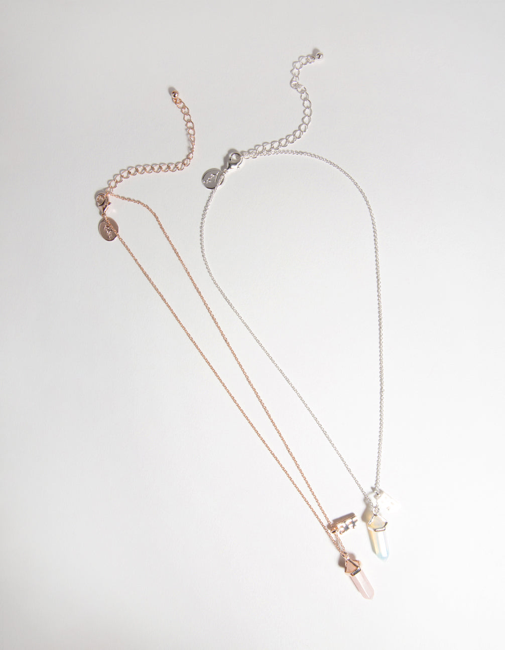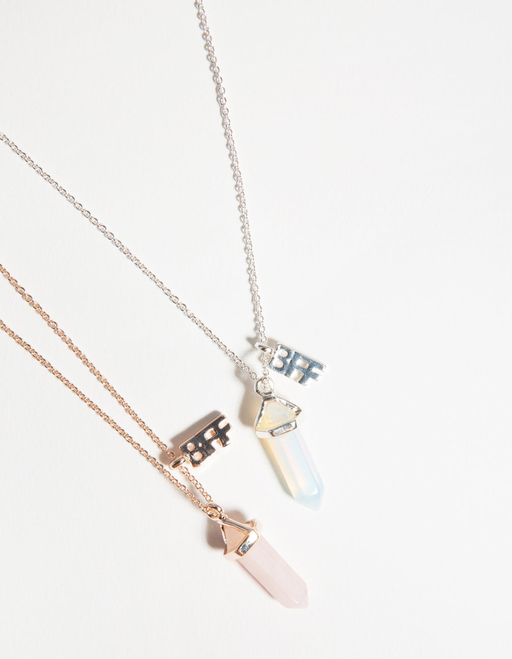 Lovisa KidsÕ Collection is perfect for little ones with big imaginations. This necklace set is meant for two besties. It comes with two necklaces, one in a silver tone with a milky stone and the other in a rose-gold tone with a pink-hued stone. Both necklaces have a hanging BFF pendant for two peas in a pod!